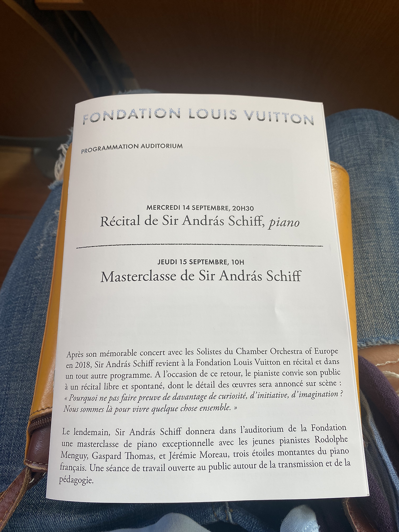 루이비통 재단은 올 9월부터 2022-2023 프로그램을 새롭게 시작한다. 현재, 10월 초 새롭게 선보이게 될 그림 전시를 한창 준비 중이다. 그래서 갤러리는 임시 휴업 상태이지만 오디토리움에서 하는 음악회는 진행된다. 9월 프로그램의 첫 테이프를 끊은 연주자는 바로 53년생 헝가리 출신 피아니스트 Sir András Schiff의 피아노 리사이틀 및 마스터 클래스였다. 14일 피아노 리사이틀이 저녁 8시 반에 있었고, 다음날인 15일 오전 10시부터 오후 1시까지 마스터 클래스가 있었다. 대게 음악회는 평일 저녁 늦은 시간에 있어서 어린아이가 있는 나는 가고 싶어도 갈 수 없다. 아무리 가까워도 음악회가 끝나면 밤 10시가 되기 때문이다. 다행히 마스터 클래스는 낮 시간 대라서 갈 수 있었다. 날씨가 좋았다. 9시 40분에 집을 나섰다. 볼로뉴 숲은 언제나 그렇듯 맑고 청아하고 평화로운 녹색빛이었다. 사람들이 많았다. 오디토리움에는 좌석이 거의 다 찼다.