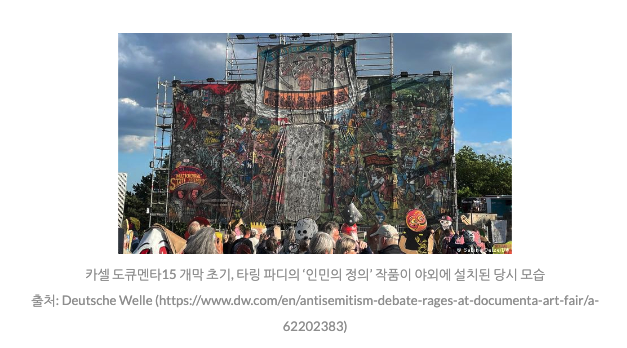 도큐멘타15는 개막 초기부터 논란에 휩싸이더니, 7월 16일(현지시각) 도큐멘타 감독 위원회와의 상호 동의 하에 도큐멘타 사무총장인 사빈 쇼르만(Sabine Schormann)이 사임했다. 알렉산더 파른홀츠(Alexander Farenholtz)가 임시 책임자로 새롭게 임명됐다. 논란의 발단은 다음과 같다. 타링 파디(Taring Padi)라는 인도네시아 아티스트 그룹이 <인민의 정의(People's Justice)>라는 작품을 선보였고, 이는 반유대주의(Anti-Semitism)적인 이미지를 내포하고 있다는 논란에 휩싸이면서 개막 3일 만에 철거됐다. 주 독일 이스라엘 대사관 및 독일 문화부 장관 등 각계각층에서 반유대주의적 작품이라고 목소리를 높였다. 예술과 정치 및 종교는 분리해서 생각할 수 없는 것일까? 예술에서 표현의 자유는 어디까지 허용되는 것일까? 예술가들이 작품 활동에 있어 지속적으로 자기 검열을 해야 한다면 이는 진정한 예술 활동이라고 할 수 있을까?