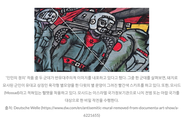 그렇다면 도큐멘타 주최 측에서는 인민의 정의가 반유대적인 이미지를 포함하고 있다는 것을 알고도 눈감아 준 것일까? 아니면 정말 몰랐던 것일까? 때로는 미디어가 반유대주의를 조장하기도 한다는 리아 씨의 말처럼 이슈 몰이를 위한 노이즈 마케팅을 벌인 것일까? 아이러니하게도 나치 정권의 만행에 대한 성찰과 반성에서 시작된 카셀 도큐멘타1(1955년)이 도큐멘타15(2022년)에서는 반유대주의 이슈로 인해 화제가 되고 있다. 세계적인 시각 예술가이자 영화감독인 독일 출신의 히토 슈테옐(Hito Steyerl)은 이번 반유대주의 사태와 관련한 경영진들의 미흡한 대응 및 예술가들의 근로 조건과 근무 환경 등의 문제를 지적하며 자신의 예술 작품 철거와 함께 도큐멘타15를 떠났다. 또한, 7월 말에는 알제리 여성 아티스트 그룹의 작품도 반유대주의적 요소가 있다는 이유로 전시에서 삭제됐다. 이처럼 계속되는 예술 작품 검열, 표현의 자유 억압 및 문제해결을 위한 대화 및 토론 거부 등으로 인해 도큐멘타15에 참여했던 예술가들이 하나둘씩 떠나고 있으며, 작품들도 점점 사라지고 있다. 이에 8월 초(현지 시각)에는 '과연 100일이 될 무렵 카셀 도큐멘타15에 남아있을 작품이 있을까?'라는 우려와 조롱이 뒤섞인 뉴스 기사도 나왔다. 행사가 끝날 무렵, 카셀 도큐멘타15는 전 세계 사람들에게 어떻게 기억될지, 역사적으로 어떻게 기록될지 귀추가 주목된다.