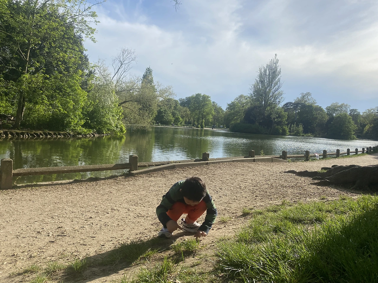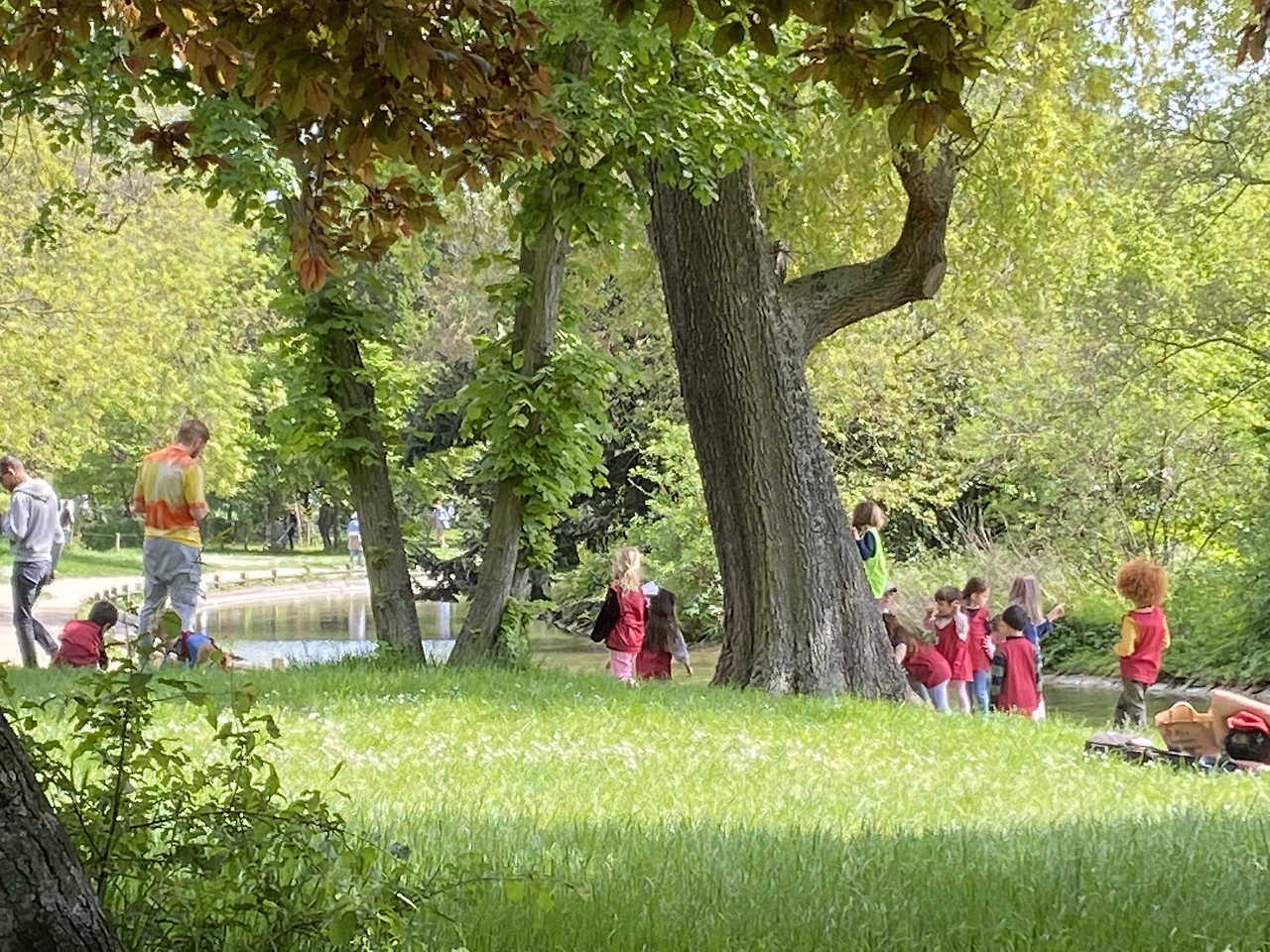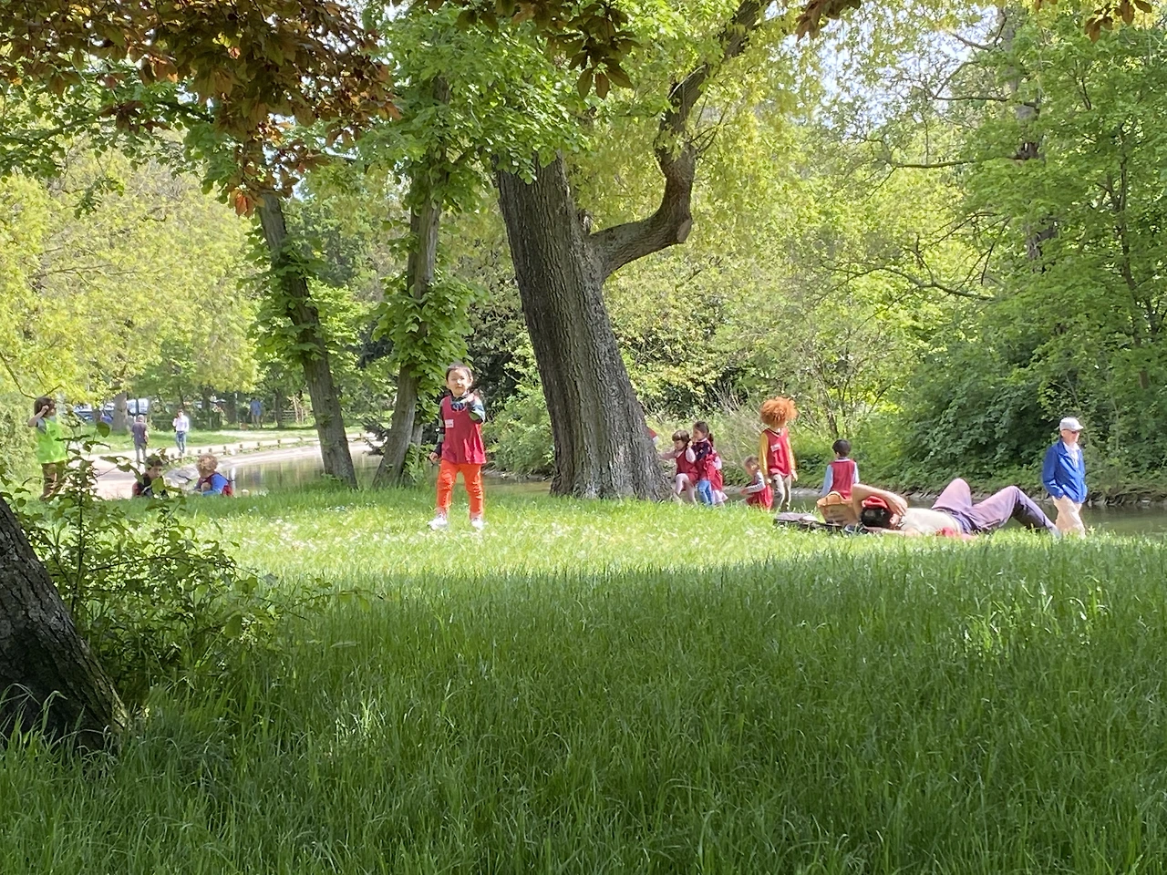 어느 수요일 오후, 잠깐 볼로뉴 숲을 지나고 있었는데 갑자기 어디선가 "엄마!" 하는 소리가 들렸다. 누군가 싶어 옆으로 돌아보니, 아들 우진이었다. 말 그대로 '네가 거기서 왜 나와?'였다. 오늘은 분명 야외 활동이 없었는데 왜 아이들이 이곳 숲에 있는 것이지? 인솔해온 선생님 2명이 오늘 날씨가 너무 좋아서 15~20명 정도 데리고 나왔다고 했다. 아이들은 모두 빨간색 유니폼을 입고 있었다. 관리하기 쉽고, 혹시 모를 일에 대비하기 위함이었다. 유니폼에는 기관명, 연락처가 적혀있었다. 우리 모자는 너무 반가운 나머지 둘 다 어안이 벙벙했다. 잔디밭에 앉아서 아이들을 지켜봤다. 아이들은 숲 속에서 그냥 뛰어놀았다. 선생님은 안전만 체크하고, 아이들이 자유롭게 놀 수 있도록 내버려 뒀다. 개미를 한참 관찰하거나, 나무에 올라가거나, 곤충을 관찰하는 등 자유롭게 자연 속에서 놀았다.