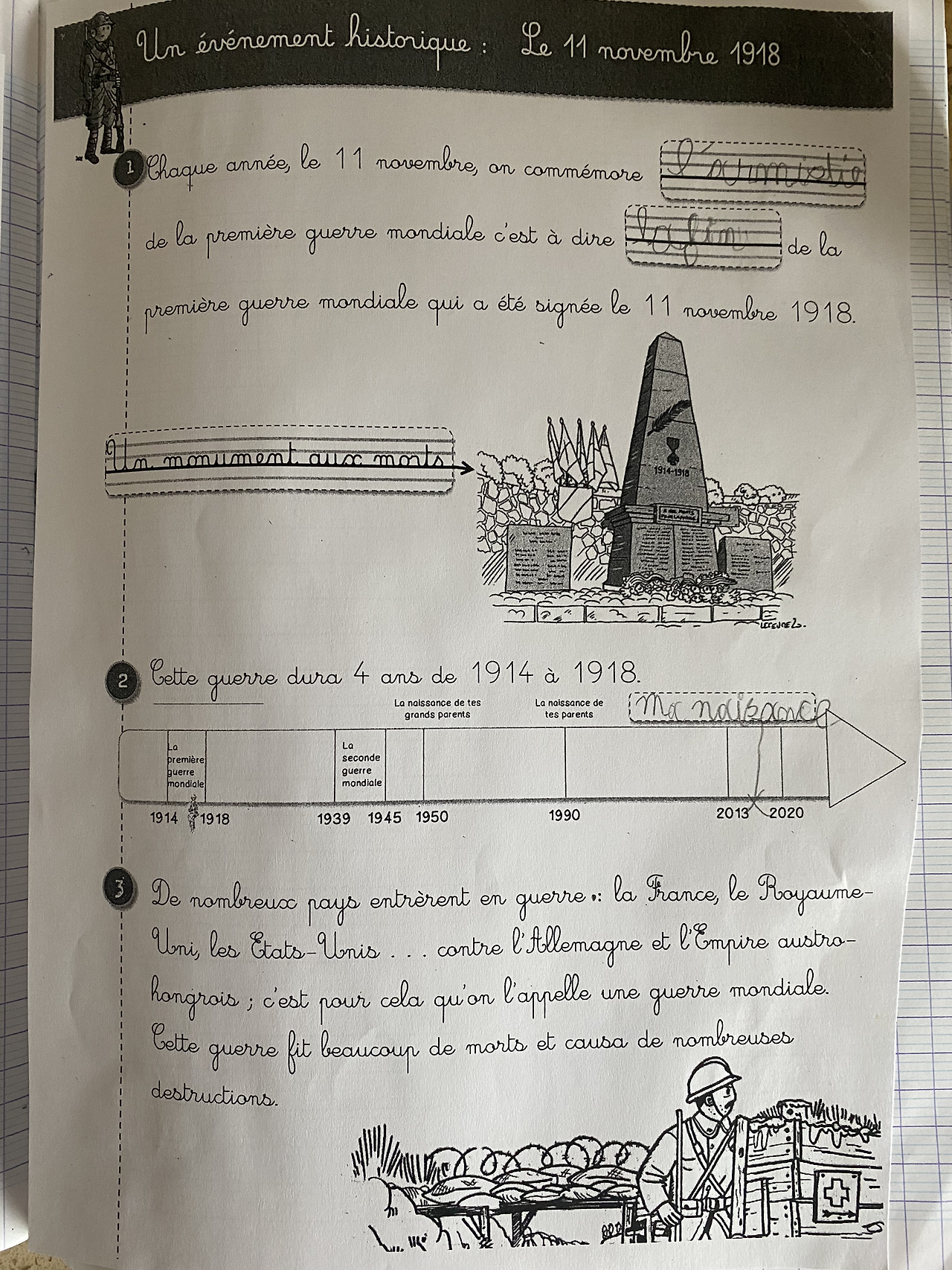 역사, 지리 등도 배운다. 영어도 배우긴 하는데 비중이 높지 않다. 초등 1학년에게는 모국어인 프랑스어를 읽고 쓰기가 우선이기 때문이다. 역사에 관한 내용은 매우 신선했다. 한국으로 치면 고구려 시대, 조선 시대에 대해 배우는 것이라면 이곳 프랑스는 제1차 세계 대전에 대해 배운다. 이곳 프랑스는 매년 11월 11일은 공휴일이다. 1차 세계 대전과 관련된 공휴일이다. 이 날에 대해 배우는 내용이 참으로 신선했다. 연대별로 세계 1차 및 2차 대전이 일어난 것을 보여주고, 아이들 조부모님께서 태어난 시대, 부모가 태어난 시기, 그리고 너희들이 태어난 해를 알려줬다. 이렇게 공부하면 나와, 나의 가족과 관련해서 역사가 머리에 쏙쏙 들어올 것 같다.