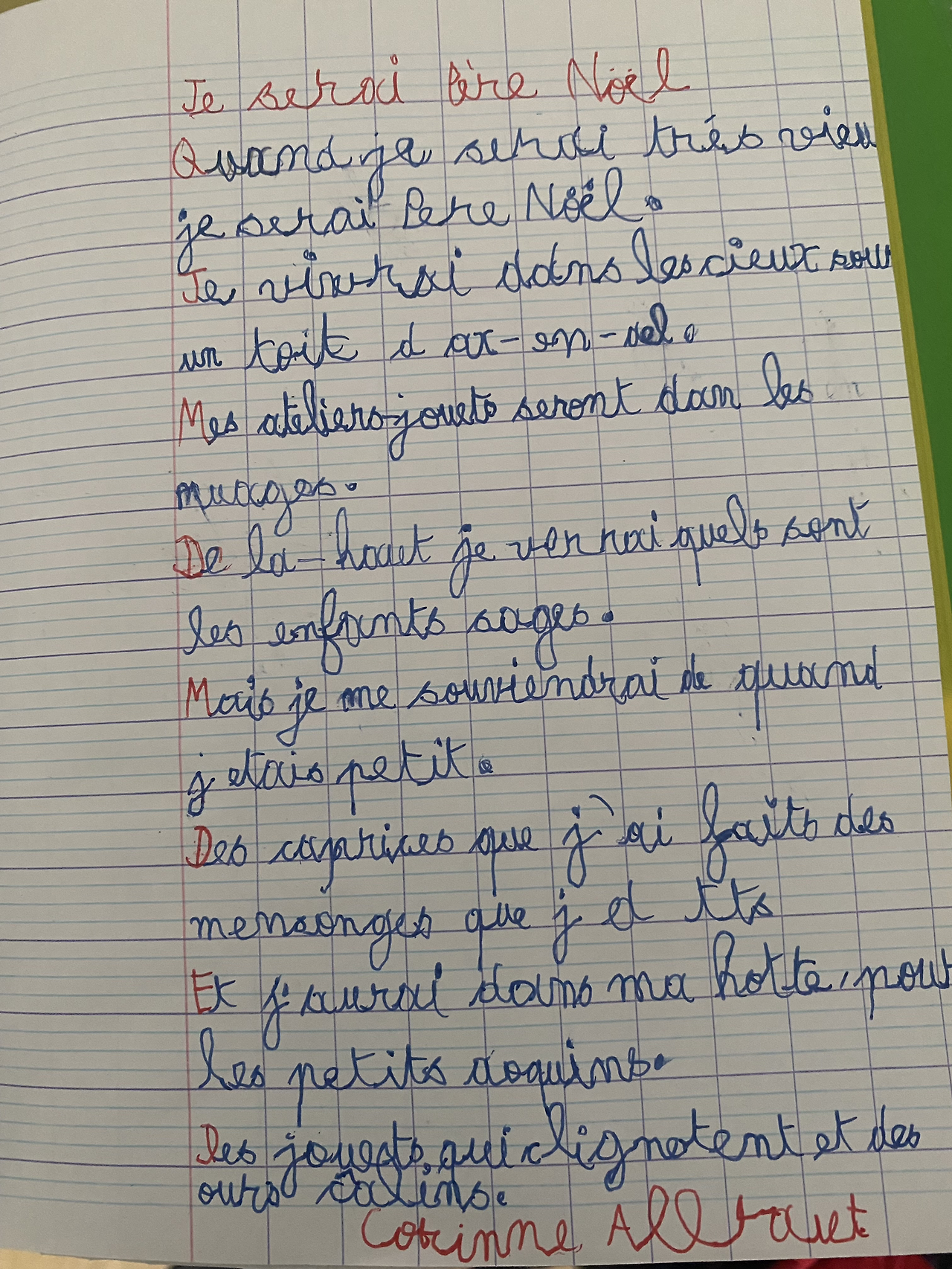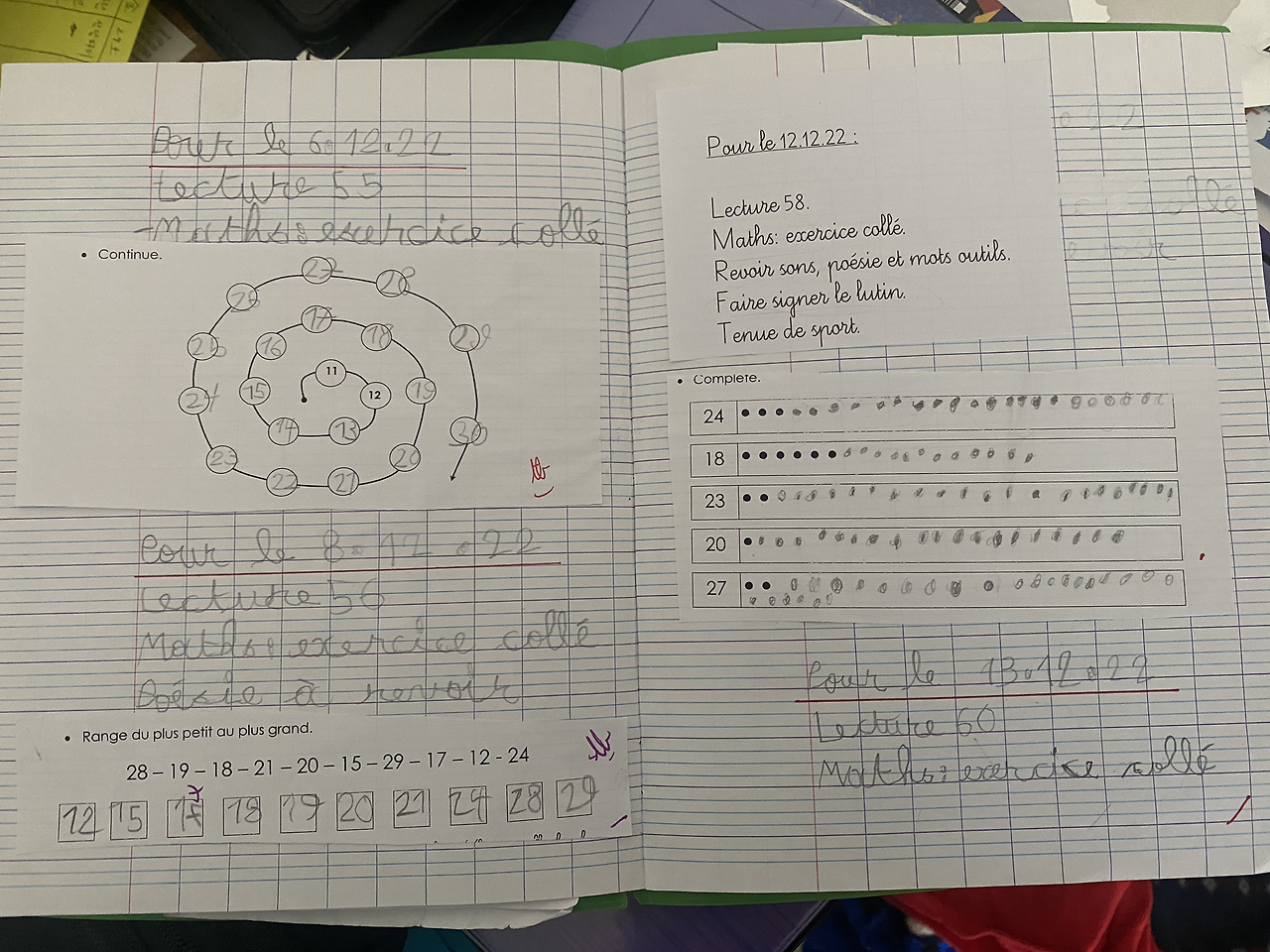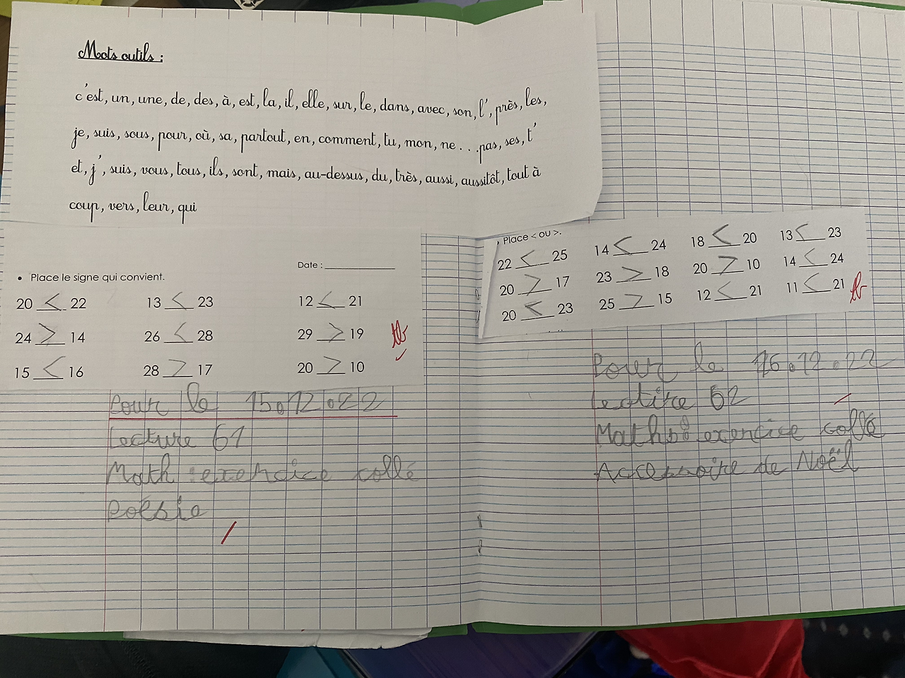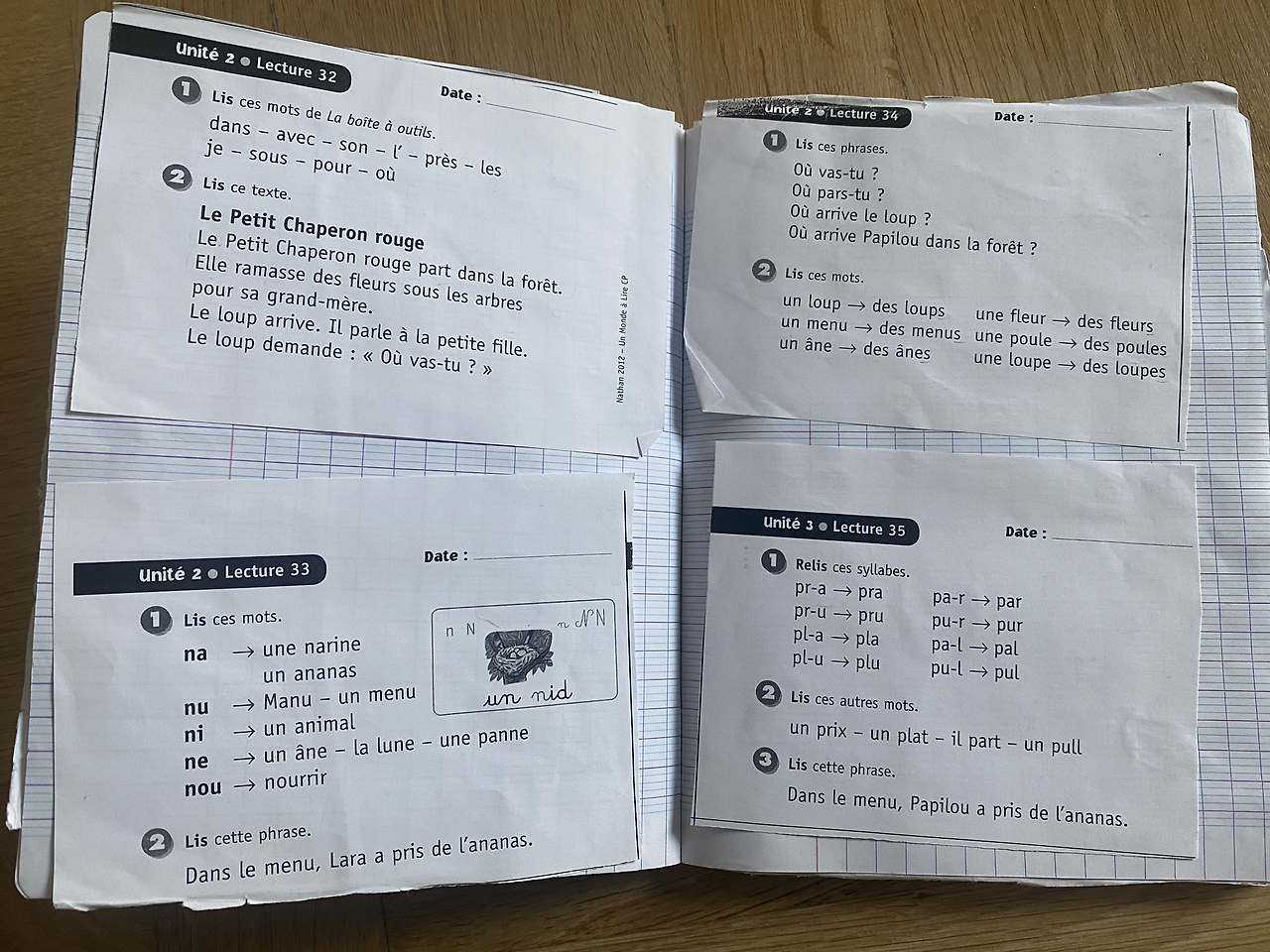 프랑스 초등학교는 아날로그 방식이다. 연필로 알파벳을 꼭꼭 눌러쓰고 있다. 대문자 소문자를 구별해야 하고, 필기체로 적어야 한다. 갖가지 색연필로 알파벳 색깔을 구별해서 적는다. 읽기라고 적힌 보라색 노트가 있는데, 선생님이 나눠준 종이쪽지를 아이들은 스스로 자기 노트에 풀로 붙인다. 그래서 필통에는 늘 풀이 2개씩 들어 있어야 한다. 나눠준 수많은 종이쪽지를 매일 노트에 붙여야 하기 때문에 풀이 많이 사용된다. 풀은 늘 집에 상비약처럼 구비해 둔다. 초등학교 1학년 고사리 손으로 붙인 종이는 모서리에 풀이 덜 발려서 끝이 너덜너덜하다. 그래도 스스로 정성스레 붙인 종이라고 소중하게 다루며 보고 또 본다.