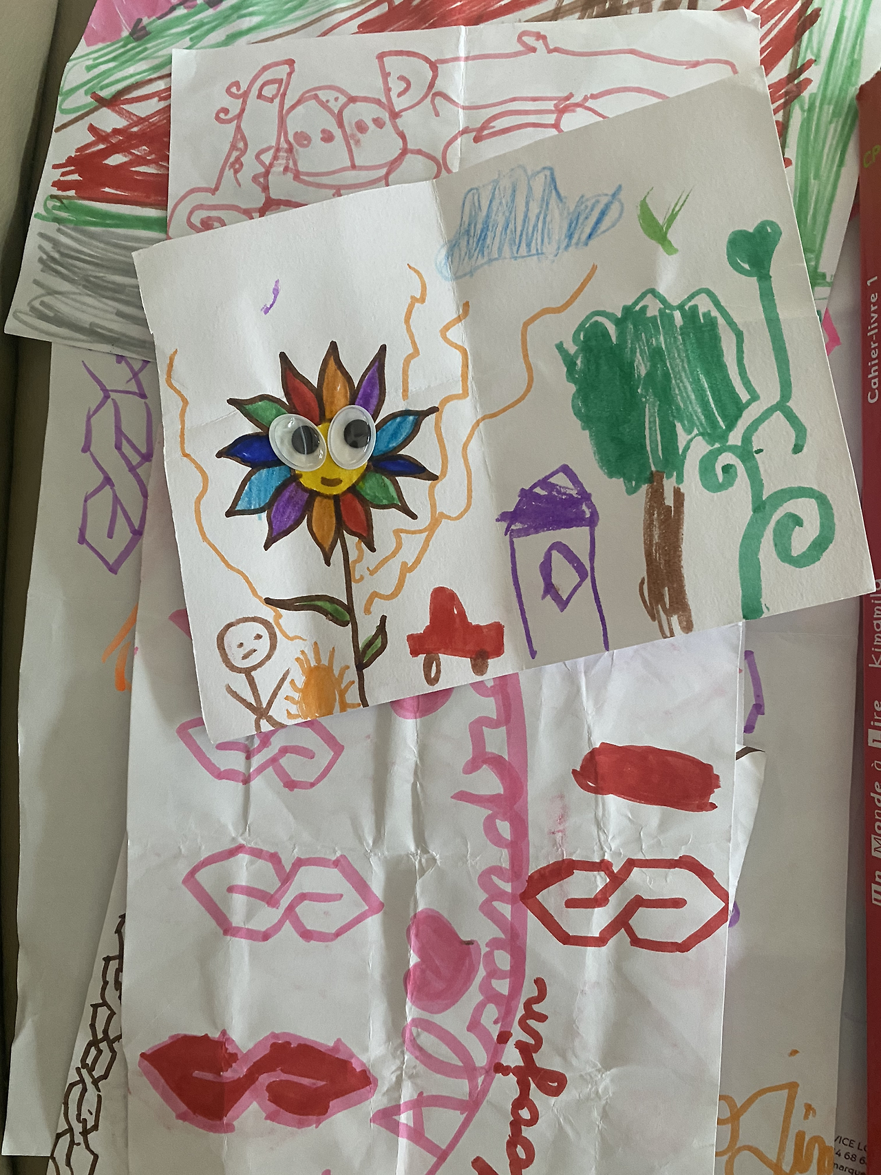 매일 아이는 양쪽 호주머니에 꼬깃꼬깃 여러 번 접은 딱지처럼 생긴 종이를 집에 오면 한 아름 풀어낸다. 엄마에게 보여주고 싶은 마음에 꾹꾹 눌러 작게 만든 종이를 펼치기 전에 눈을 감으라고 한다. 눈을 뜨라고 할 때 뜨면 아이는 자기가 그린 그림을 일일이 설명한다. 종이는 사이즈가 제각각이고 종이도 질이 그다지 좋지 않은 얇은 이면지다. 그러나 아이는 자기 만의 상상력을 펼쳐가며 독창성 있게 생각하는 바를 그림으로 풀어냈다. 나는 이것을 버리지 않고 늘 모아둔다.