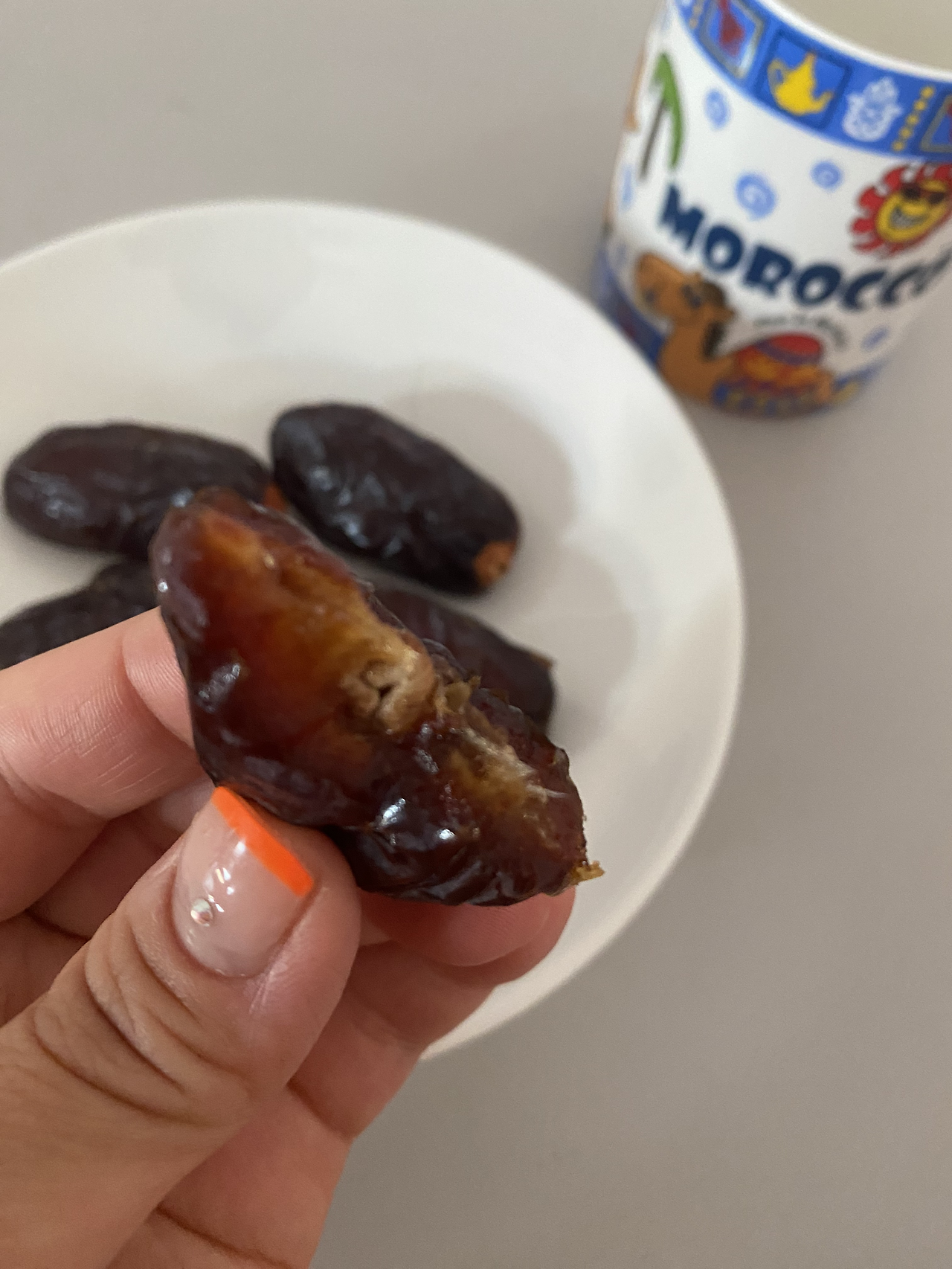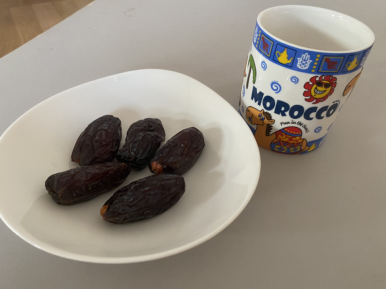 E는 한 달 동안 모로코에서 휴가를 보내고 돌아왔다. 한국에 있을 때도 사진을 주고받긴 했지만 직접 보니 E는 정말 많이 컸다. 서핑도 하고 말도 타고 스포츠를 많이 했다는데 그래서인지 전체적으로 살이 빠져보였다. 방학 동안 모든 아이들이 한 뼘씩 훌쩍 자라 있었다. E엄마 F는 모로코 컵,열쇠고리, 특산품을 줬다. 대추같이 생겼고 맛도 대추인데훨씬 크고 맛이 달고 좋았다. 낙타와 태양이 그려진 모로코 컵에다가 우진이는 물을 따라 마셨다.