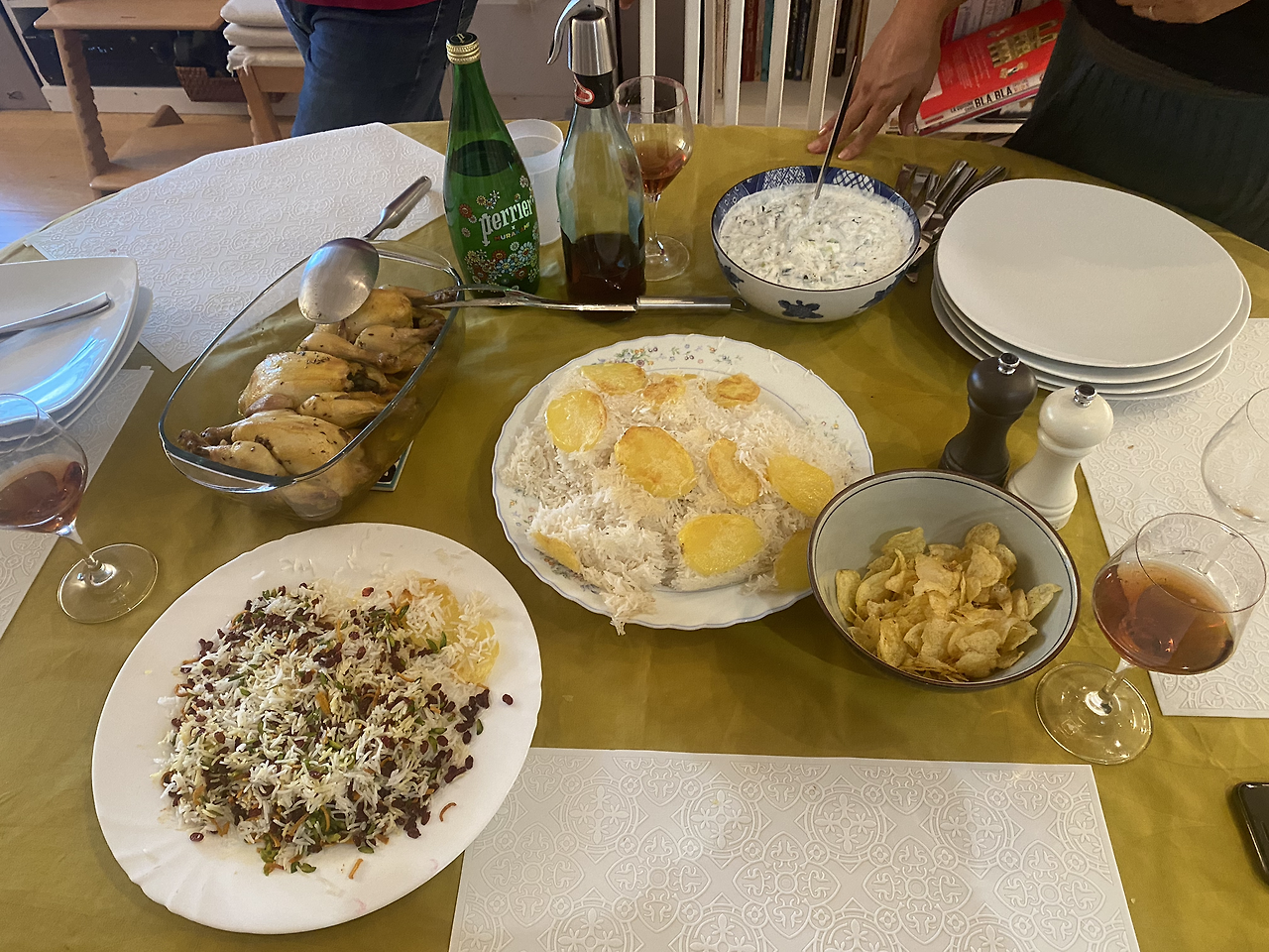 다들 건강히 잘 지내고 있었다. 여름 바캉스를 어떻게 보냈는지 각자 이야기를 나눴다. 한국에서 있었던 일들을 얘기해 줬다. 그녀는 꼭 한번 한국에 가고 싶다고 했다. 이란 음식은 한국과 비슷한 면이 있다. 쌀을 먹는다. 쌀에 오렌지 껍질과 다른 무엇을 넣었는데, 맛이 좋았다. 어린 닭을 사서 국물을 맛있게 끓여냈는데 일품이었다. 그리고 우리나라로 치면 동그랑땡 같은 것인데 그것도 직접 일일이 다 만들어서 준비했다. 손이 많이 가는 음식으로 보였다. 오이를 잘게 썰어 요거트, 마요네즈, 각종 향신료 등을 넣어 직접 만든 이란 스타일 소스는 상큼했다. 이란 음식은 한국인 입맛에 맞는 것 같다. 신랑도 맛있다며 잘 먹었다. 와인을 곁들이고, 각종 이야깃거리들을 나누며 저녁은 더욱 무르익어갔다.