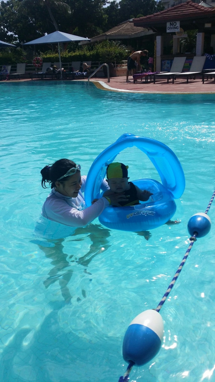 호텔 수영장에서 튜브 위에 아기를 올려놓고 가볍게 물놀이를 할 수 있다. 잠깐의 물놀이는 아기도 좋아한다.
