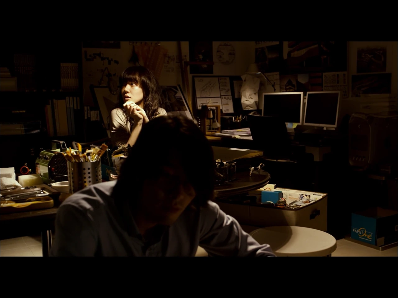 또한 소품 하나하나 영신의 감각이 돋보인다. 책장 위 지구본들과 시계 다 마신 캔, 디자인 조명. 이 집에는 영신 말고 지하에 지석의 작업실 또한 존재한다. 영신의 작업실은 집에서 가장 위층, 지석은 지하. 지하에 있는 지석의 작업실은 어둡고 영신만큼 뭐가 많다.