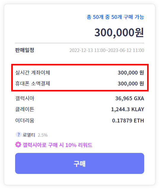이러한 이유에서 NFT 구매 장벽을 없애고 고객 편의를 높이기 위해 저희 메타갤럭시아는 가상자산뿐만 아니라 현금으로도 NFT를 구매할 수 있도록 지원(1차 판매에 한함*)하고 있습니다.