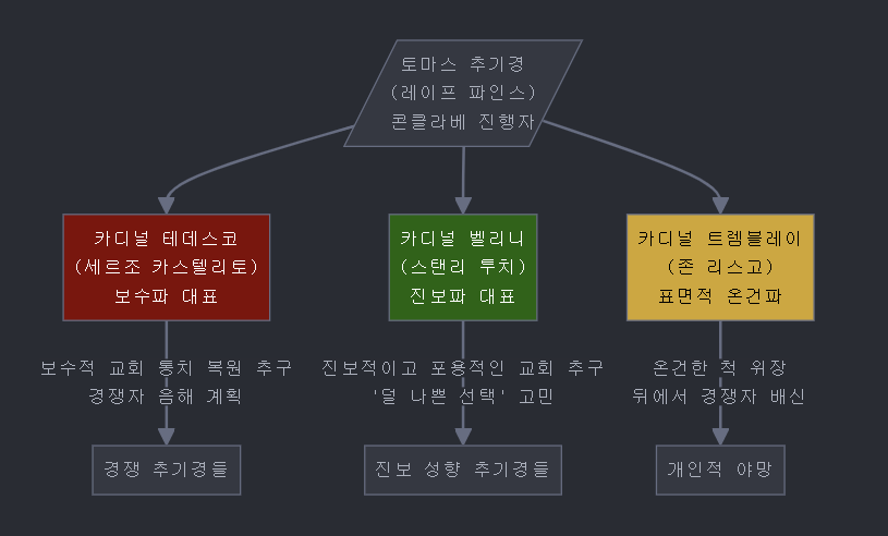 영화는 각기 다른 정치적 입장을 가진 주요 추기경들의 갈등을 통해 권력 투쟁의 본질을 드러냅니다. 예를 들어, 카디널 테데스코(세르조 카스텔리토)는 보수적인 교회 통치를 복원하려는 열망으로 가득 차 있으며, 그의 지지자들은 다른 후보들을 음해하려는 계획을 세웁니다. 반면, 카디널 벨리니(스탠리 투치)는 진보적이고 포용적인 교회를 꿈꾸며, 동료들에게 "우리는 최악이 아닌 덜 나쁜 선택을 해야 하는 것인가?"라는 질문을 던지며 자신의 실망감을 표현합니다. 또한 카디널 트렘블레이(존 리스고)는 겉으로는 온건한 후보처럼 보이지만, 뒤에서는 경쟁자를 배신하며 자신의 야망을 드러냅니다.