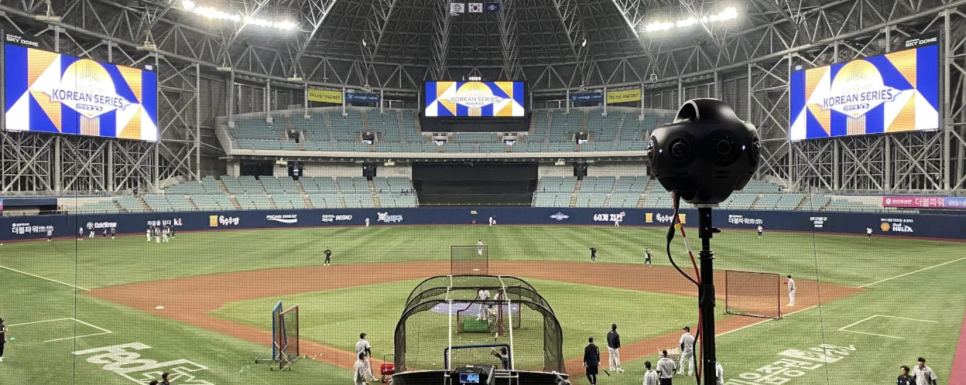 그럼 5G 시대를 살고 있는 지금의 VR 생중계는 어떨까요? 2021년에는 코로나19 팬데믹으로 전세계 프로스포츠가 위기를 맞았죠. 팬이 없는 프로스포츠는 정말 어색하게 느껴지기도 했습니다. 이에 너도나도 색다른 생중계에 도전했습니다. 한 예로 2020 한국 프로야구 코리아 시리즈를 무려 8K VR로 실시간 중계를 시도했죠. LG U+에서 진행했던 해당 VR 생중계 프로젝트는 과거의 VR 생중계의 단점을 극복하고 5G 도입에 8K 화질까지 도입했습니다.