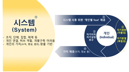 개인 성공이 시스템 성공으로 이어지기 때문에, 개인 능력 발휘가 시스템과 개인 연결의 핵심이다. 시스템은 개인에게 ‘툴’을 제공하여, 개인이 능력을 발휘하도록 판을 깔아주고, 날개를 달아준다. 툴 제공 후에는 ‘관리’와 ‘통제’보다는, 개인이 마음껏 능력을 발휘하도록 ‘자율성’을 줘야 한다.