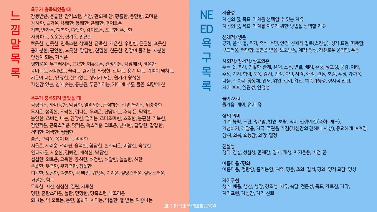 감정에 휩쓸려 가고 있을 때, 잠깐 멈추어서 그 감정의 이면에 있는 욕구와 필요를 떠올려보자.