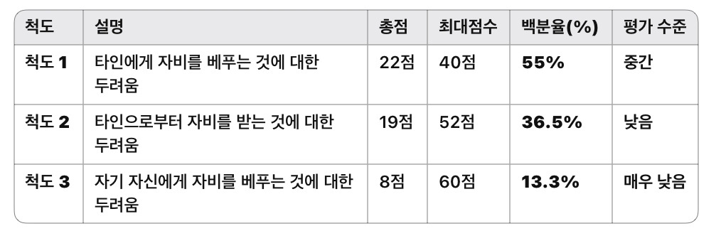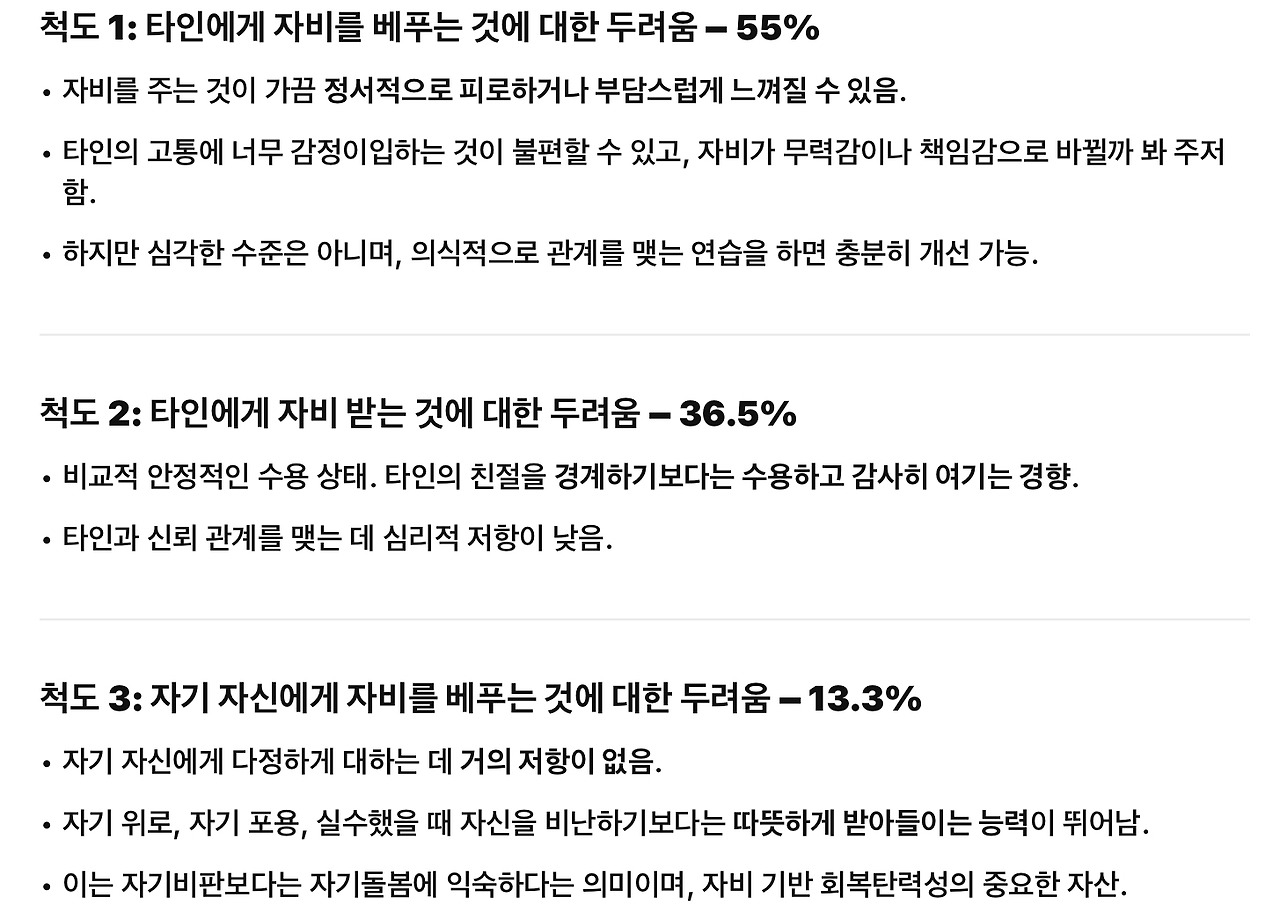 - 놀란 부분은 자기 자비에 대해서는 두려움과 타자로부터 친절을 받고 표현하는 데에도 두려움이 낮은 편인 데, 진작 타인을 향한 친절과 자비를 베푸는 데에는 두려움이 꽤 있는 편이다.