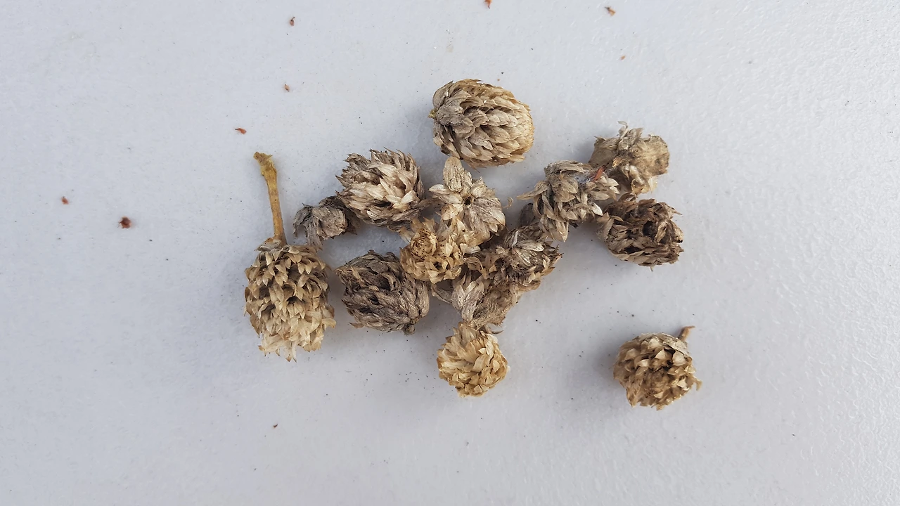 그 작고 동그란 얼굴이 얼마나 귀여운지 자세히 들여다보면 놀라운 사실을 알게 된다. 이 보랏빛 원형은 꽃이 아니라 여러 개의 '포'이고 '포'의 끝자락에 듬성듬성 별처럼 노랗게 박혀 있는 것이 '꽃'이다. 먼지만큼 작지만 '포'와 대비되는 색깔 때문에 눈에 콕콕 박힌다. 별 같은 노란 꽃이 지고 나면 꽃받침에 가까운 부분부터 갈색으로 변하기 시작하는데 씨앗을 만들어 가는 신호다. 다 여물어 갈색이 된 꽃을 털어보면 보송하고 하얀 털로 덮인 씨앗을 발견할 수 있다. 솜 옷을 입은 듯 꽁꽁 싸여 있어 하얀 털을 손톱으로 잡아 뜯고 나서야 참깨보다 작은 까만 씨앗이 나온다. 이듬해에 심고, 씨앗 나눔을 할 생각으로 씨앗을 받아둔다.