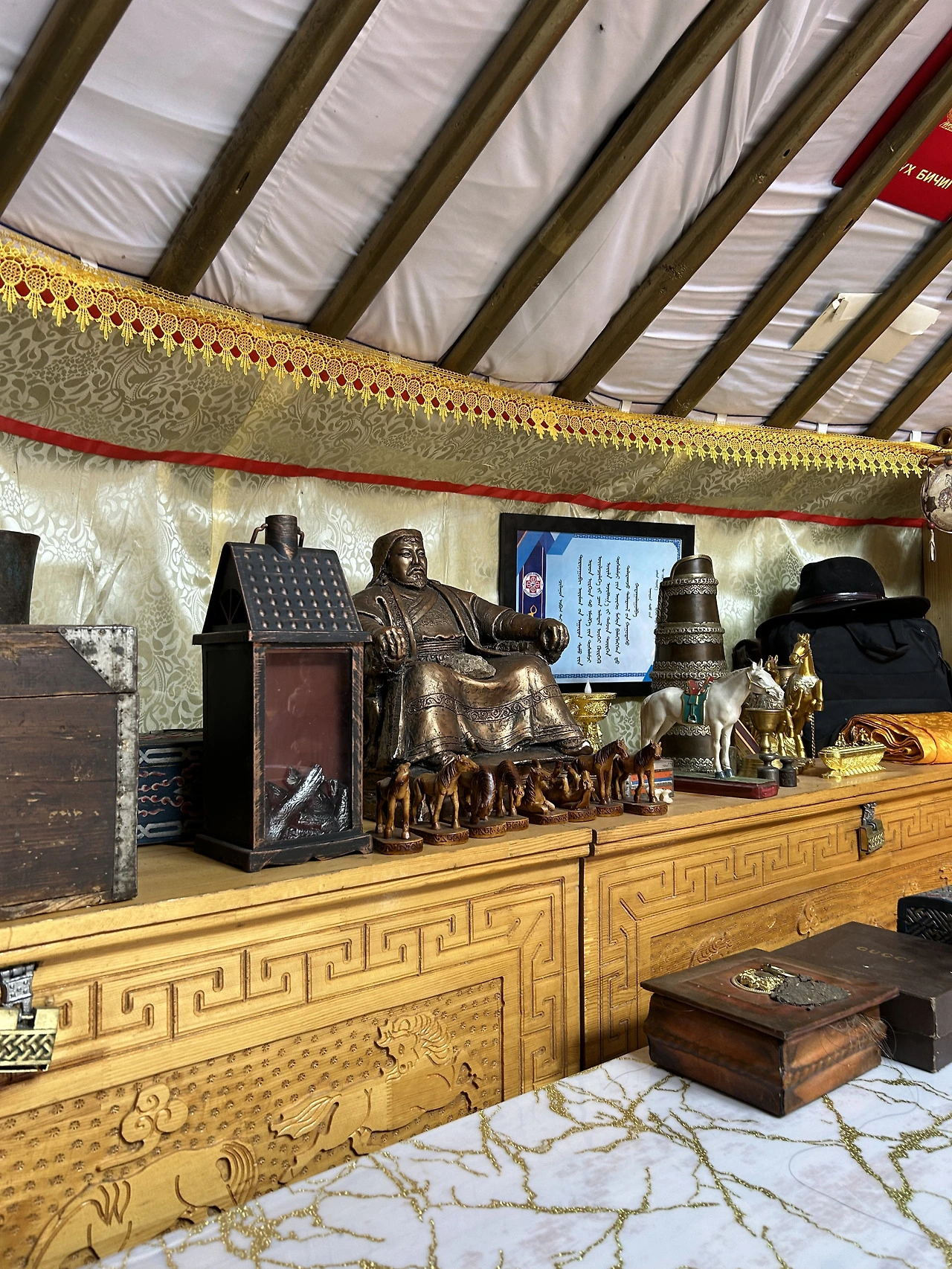 우리는 간식을 먹으며 가이드님에게 실제 몽골인들이 사는 게르에 대한 설명을 들었다. 간식을 다 먹고나서야 게르의 내부가 눈에 들어오기 시작한 것이다. 나는 맞은편에 출입문이 위치할 정도로 게르의 가장 안쪽에 들어왔는데, 그 가장 안쪽의 천장에는 몽골 전통 악기가 걸려있고 가족사진이 놓여있었다. 몽골의 전통 악기는 바이올린처럼 생겼으면서도 말 머리가 달려 있는 게 독특해보였다. 그리고 몽골은 다산을 한 가족에게 특별 훈장을 내린다고 하는데, 가족 사진을 보니 그 훈장을 이미 받고도 남을 정도로 구성원이 많았다. 그리고 가족에게 중요한 행사가 있을 때 말에게 얹는 말의 안장도 구경했고, 집에 걸려있는 천에 색깔에 대한 의미에 대한 설명도 들었다. 게르에 대한 설명과 내부 장식장을 보니 이렇게 많은 것이 세팅되어 있는 집도 이동 생활을 하는지 궁금했는데, 보통 몽골인들은 이런 게르를 해체하고 설치하며 유목 생활을 한다고 한다. 짐들은 보통 낙타가 짊어진다고 하는데, 꽤나 고생한다는 생각이 들었다. 내가 지금 머물고 있던 가정집은 이동 생활을 하는 집은 아니라고 했는데 이 집에서 기르는 말을 타고 승마체험을 한다고 하니, 아마 이런 관광객을 위해 식사를 내고 전통 게르 설명을 위한 공간을 내어주며 승마 체험을 업으로 하는 집이어서 다른 가족과는 다르게 정착 생활을 하는 듯하다는 생각이 들었다.
