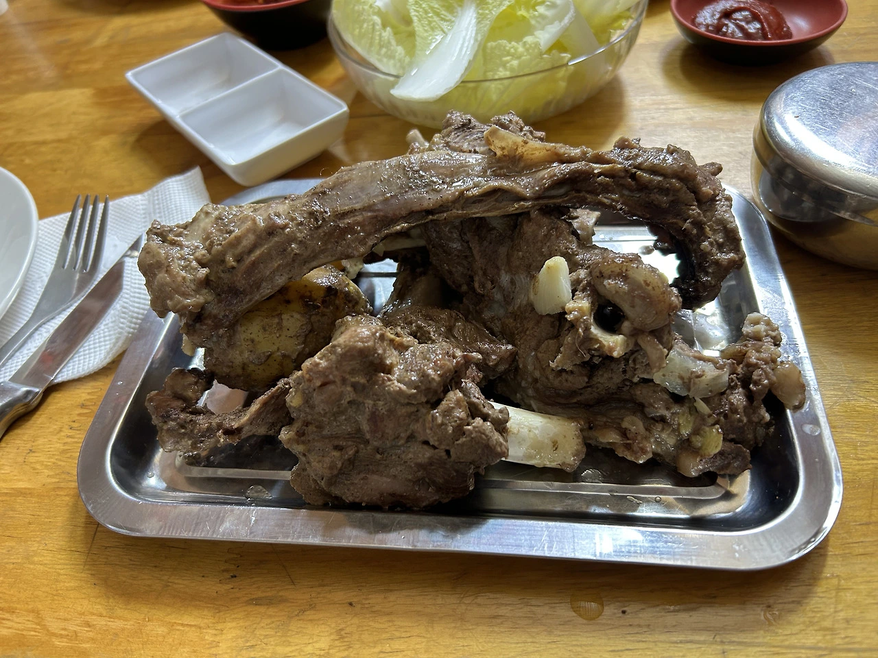 이번 식당에는 여러 테이블이 이어진 두 개의 긴 좌석이 마련되었다. 회사에서 겪은 회식 테이블처럼 느껴지는 구성이었는데, 어느 테이블에 앉아도 단체석 느낌은 피할 수가 없어서 눈에 보이는 가장 구석진 자리에 동생과 나란히 자리를 잡았다. 반대편 테이블에는 주로 여성분들이 앉게 되었고 우리 테이블에는 남성 어른들이 앉으셨다. 아주머니들은 바로 가방에서 깻잎, 고추장 등을 꺼내어 식탁에 세팅을 하셨고 아저씨들은 서로의 텀블러를 교환하며 컵에 무언가를 따르고 있었다. 그러다가 어떤 할아버지가 우리에게, "한 잔 드릴까요?" 라고 물으셨을 때 풍겨오는 내음에서 그것이 소주라는 것을 알게 되었다. 우리는 정중히 "저희는 술을 안마셔요, 괜찮습니다." 라고 말을 전했다. 아주머니들의 특유의 시끌벅적함과 아저씨들의 침묵의 술 마시는 테이블의 분위기를 굳이 비교하자면 후자가 조용히 있기는 편해서, 허르헉이 나올 때까지 동생과 담소를 나누며 마음 편히 앉아있을 수 있었다.