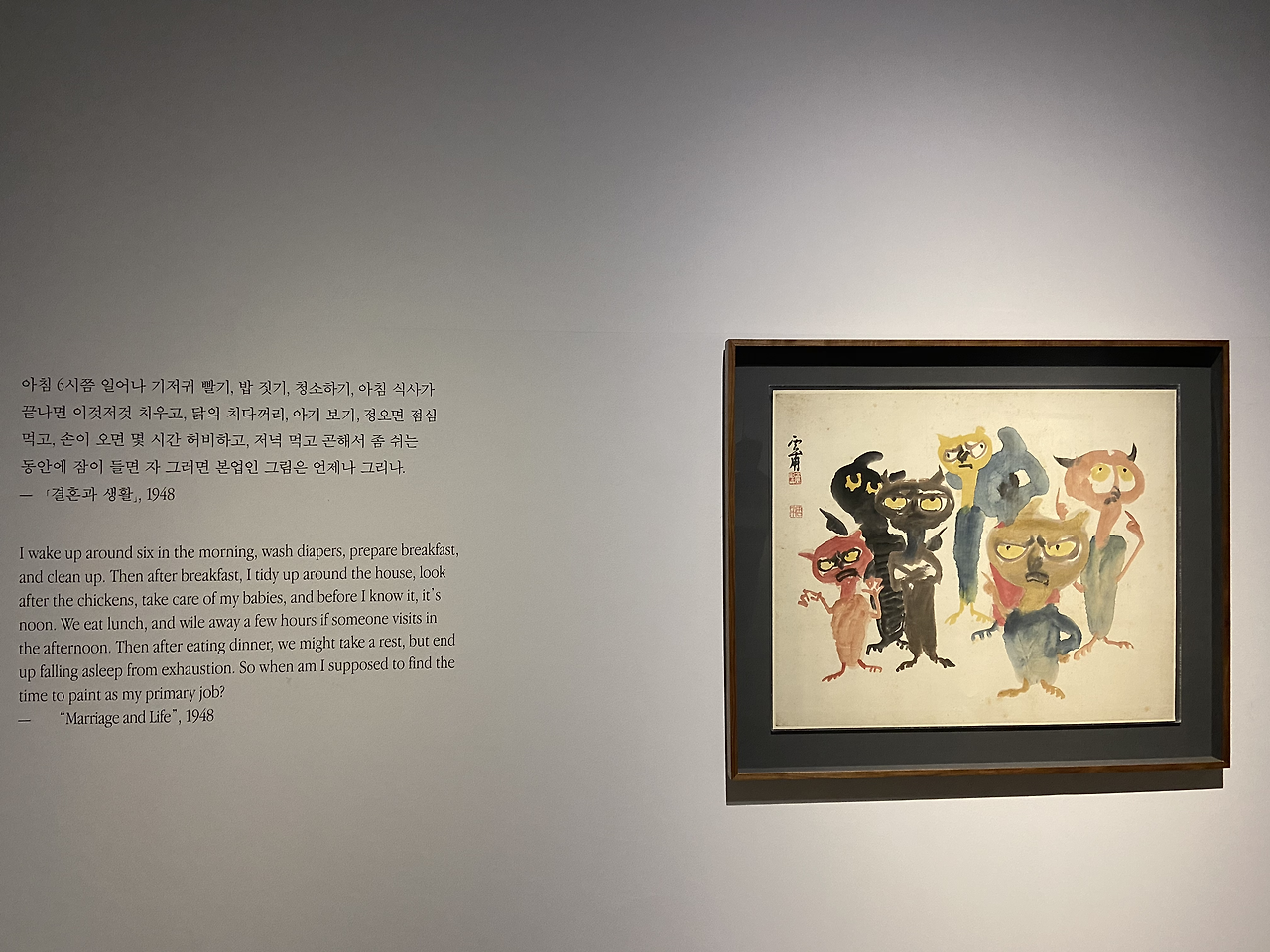 자신의 예술세계를 포기하지 않는다는 조건으로 합의에 도달한 결혼. 하지만 이 우월한 근대의 워킹맘에게도 육아와 가사는 시간을 야금야금 갉아먹는고된일이었으니, 그가 쓴 남편시중기 등에 그 고민과 고역이 문장마다 드러나있다. 잔뜩 뿔이 난 색색의 부엉이 그림 “화난우향”은, 아이 넷과 남편의 뒤치닥거리로 하루를 보내고, 식구들이 모두 잠든 밤에야 비로소 붓을 들 수 있었던 그가 자신을 부엉이라 부르며 생활과 예술을 병행했던 고충을 너무나 잘 드러내주고 있었다.