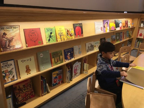 1층에는 그림책을 비롯한 여러 모임을 위한 ‘이야기방’과 140여국 나라와 지역에서 발간된 아동서들을 볼 수 있는 ‘세계로 열린 방’, 책은 물론 아이들을 위한 소규모 놀이방까지 갖춘 ‘어린이방’이 있다. 특히 어린이방의 경우는 천정 전체가 조명으로 설계되어 있어서 그림자가 생기지 않는다고 한다. 세계로 열린 방에 한국 그림책들이 있는 것은 당연한데도 막상 실체를 보니 기쁨이 컸다. 복도 끝으로는 어린이도서관답게 모유 수유실, 기저귀를 갈 수 있는 아기 침대뿐만 아니라 분유를 탈 수 있는 뜨거운 물도 항시 준비되어 있었다.