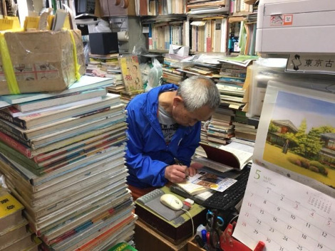 일본 초기 그림책과 절판이 된 그림책을 비롯해 여러 나라의 중고그림책들과 빛이 바랜 동화책 등이 그야말로 빼곡한 책방! 그 안에 서 있자니 마치 타임머신을 타고 과거 어느 순간에 온 것 같았다. 두근거리는 마음을 감춘 채, 좁은 복도를 따라 촘촘히 진열된 책들을 훑어 보다 문득 바라본 곳이 있었다. 한 명이 겨우 들어 갈만한 공간에서 1983년부터 줄곧 이 서점을 지켜온 듯 보이는 할아버지. 무엇인가 열심히 쓰고 있는 그에게 다가가 조심스럽게 물었다.