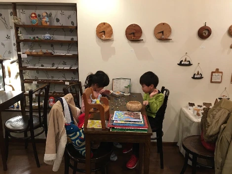 무사니닛타역에서 정겨운 동네 풍경을 감상하며 칠 분 여를 걸었을까? 틸 그린의 상징인 청둥오리 사인판이 눈에 들어왔다. 문을 열고 들어서니 타네무라씨 부부가 함박웃음으로 우릴 반겼다. 4,000여권이 넘는 그림책들이 서가마다 빼곡하게 꽂혀 있었고, 크리스마스와 이와 관련된 그림책들이 표지 진열되어 있었다. 일반서점에서는 잘 볼 수 없었던 도쿄어린이도서관에서 출판한 이야기빛(おはなしのろうそく) 시리즈물이 비중 있게 전시되어 있었고, 캐릭터 인형들과 목재 완구, 소품등도 아기자기하게 자리하고 있었다. 서점 안쪽에는 까페 겸 갤러리가 있는데, 서점과 까페를 연결한 복도에는 작고 예쁜 것들로 가득했다. 타네무라씨 부부와 내가 서점에 대해 이것저것 이야기를 나누는 동안에도 동네 아이들과 부모들이 계속해서 서점을 다녀갔다. 모두 단골처럼 보였고, 살아가는 이야기들을 나누는 것 같았다. 틸 그린이 이 지역에 어떻게 뿌리 내리고 있는 지 엿볼 수 있었다. 이번에는 대여섯 살 되어 보이는 아이 한 명과 엄마가 틸 그린의 문을 열었다. 타네무라씨 부부는 이들 모녀를 더욱 반갑게 맞이했고 이내 나와 해인을 소개했다. 영어가 유창한 아이 엄마는 자신은 마사코며 딸은 엠마라고 우리에게 인사했다. 이후 마사코는 타네무라씨 부부와의 모든 대화는 물론, 타네무라씨가 추천한 그림책에 대한 이야기와 직접 읽어 주는 그림책까지 통역했다. 그렇게 시간을 보내는 동안 문득 아이들이 궁금해 돌아보니, 해인과 엠마는 어느 덧 친구가 되어 그들만의 재미난 시간을 보내고 있었다. 말이 통하지 않아도 즐거워하는 아이들의 모습을 보며 다같이 감동했던 기억이 생생하다. 타네무라씨는 한국 그림책들을 찾아와 보여 주었다. 그것만으로도 마음이 벅찬데 그녀가 가장 좋아하는 그림책이 한국의 옛 정서가 넘치는 <넉점반>이라니! 그녀 덕분에 영미권에서 활동하고 있는 우리나라 나일성 작가도 알게 되었다.
