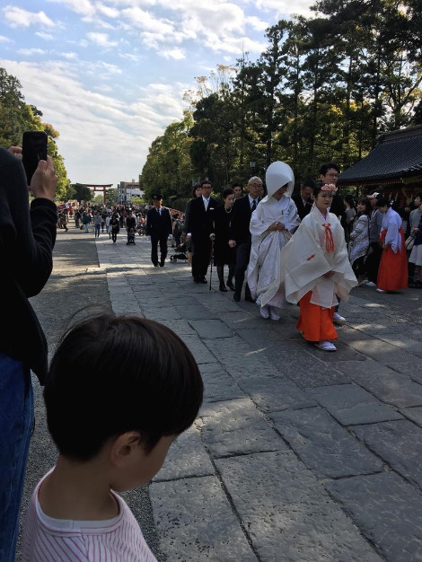 * 쓰루가오카하치만궁(鶴岡八幡宮)은 가마쿠라를 대표하는 유서 깊은 신사다. 현재와 같은 모습을 갖춘 것은 1191년으로, "가마쿠라 막부"를 개창한 무장 "미나모토노 요리토모(源賴朝)"가 현재의 위치에 사전(신사의 신체를 모시는 건물)을 건립한 때부터이다. 본궁으로 이어지는 돌계단 밑에 '마이덴(舞殿)'이라고 하는, 선명한 주홍빛의 건물이 있다. 요리토모의 동생인 요시츠네(源義経)가 사랑했던 시즈카고젠(静御前)이 춤을 선보였다고 알려진 곳이다. 매년 4월에 개최되는 가마쿠라 마츠리에서는 '시즈카노마이(静の舞)'라는 춤을 추기도 한다. 내가 갔을 때는 마이덴에서 결혼식이 있었다. 신랑과 신부의 가족들만 모여서 치러진 단출하면서도 성스런 결혼식이었다.