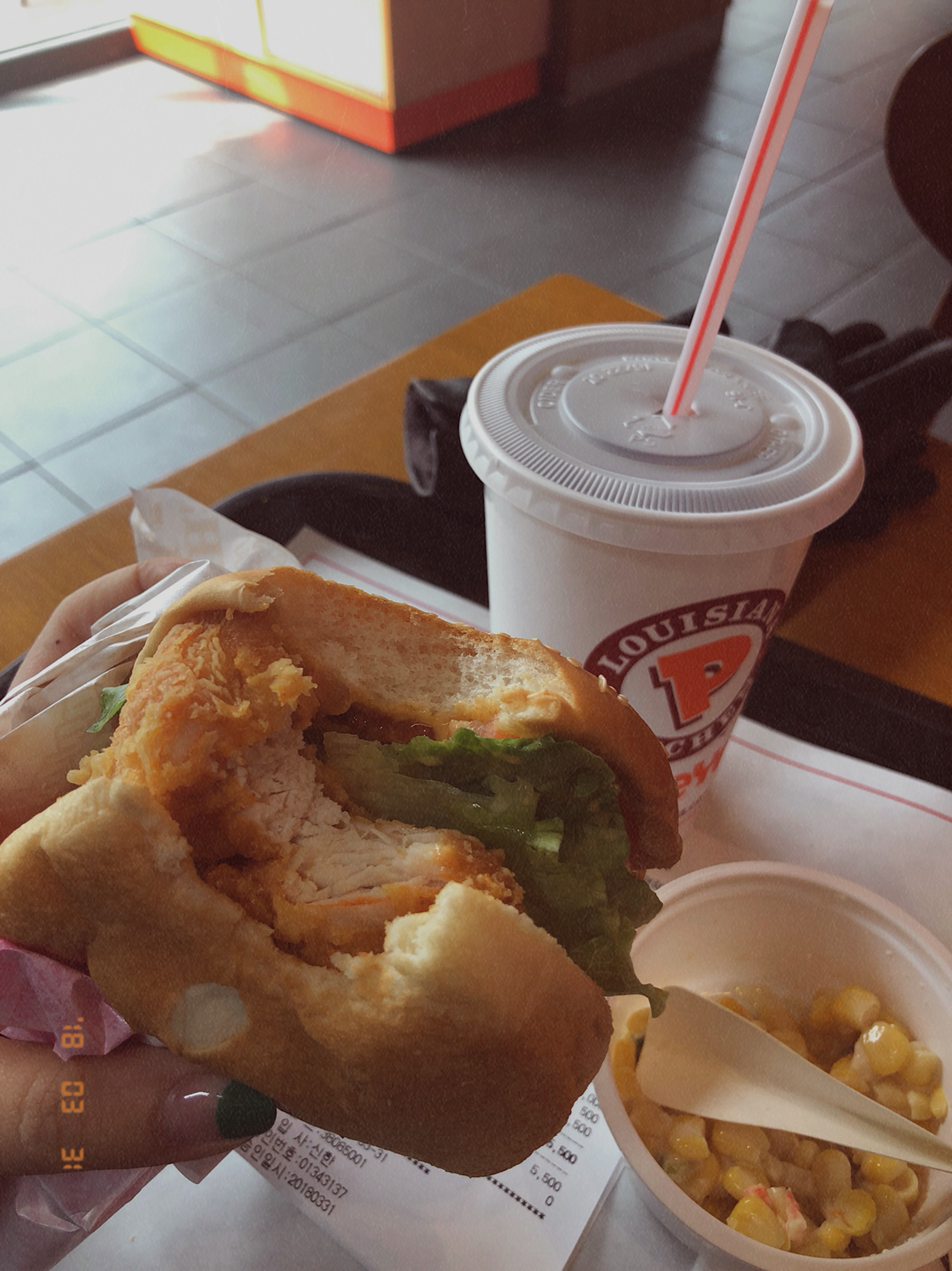 점심시간에는 원래 별도로 식권을 나눠주고 정해진 식당에서 무료로 밥을 해결할 수 있지만 오늘은 왠지 그 식당들에 가고 싶지가 않았다. (어두컴컴하고 지하로 내려가기도 싫고 친구 결혼식인데 가지도 못하고, 나는 누구 여긴 어디 이런 느낌...) 그래서 가까운 파파이스를 방문! 이름도 기억나지 않는 매콤한 치킨 햄버거를 시켰다. 햄버거는 그럭저럭 오케이. 나는 콘샐러드가 더 맛있었다.