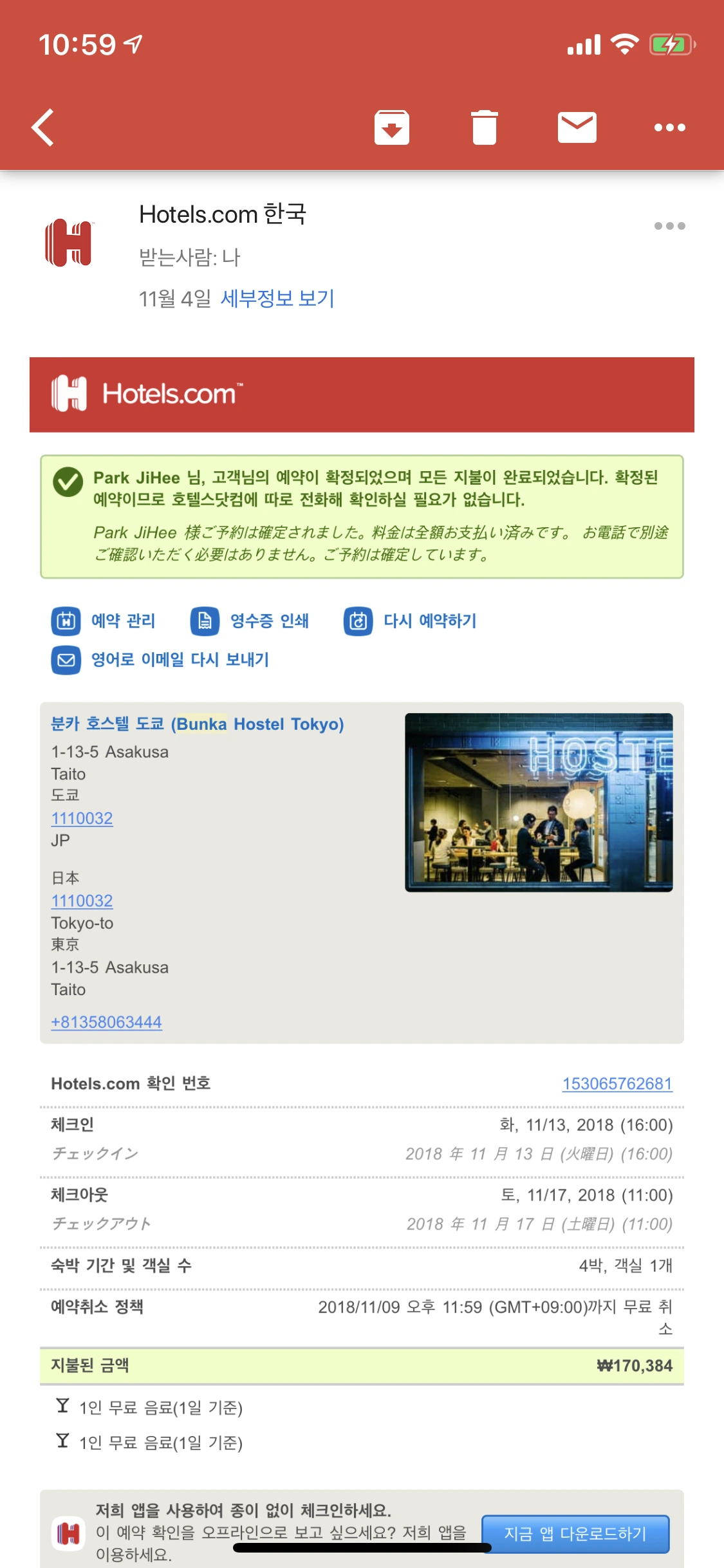 이곳이다. 평점도 높고, 가격도 저렴해서 최종 결정하게 되었는데 숙소에 대한 자세한 리뷰는 나중에 별도로 다룰 예정이다 :)