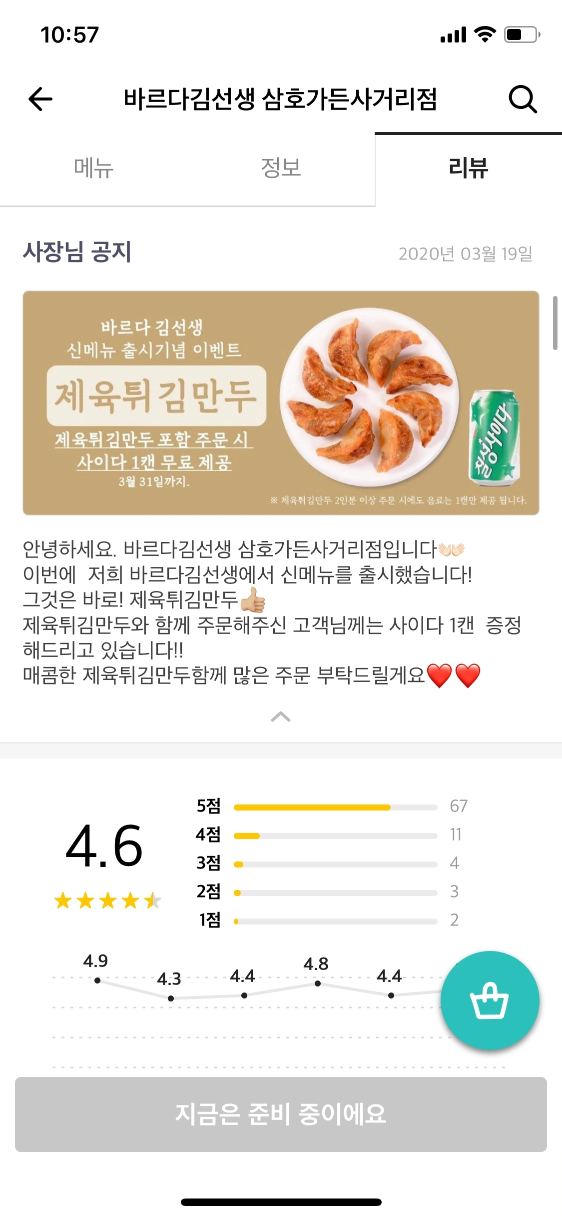 또 이번 제육튀김만두의 경우 3월 말까지 리뷰 작성 시 사이다 증정 이벤트를 진행하고 있는데 이런 사장님 공지 부분도 일괄적으로 변경하는 작업이 생각보다 쉽지가 않았다.