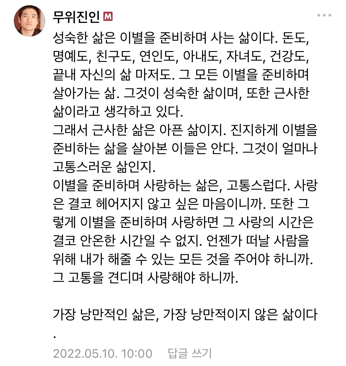 너의 슬픔이 나의 슬픔이 되었을 때, 할 수 있는 일은 둘 뿐이다. 헤어지거나 사랑하거나. 헤어질 수 없으면 사랑해야 한다. 악착같이 기뻐져서 사랑할 역량을 키워야 한다. 해야할 일을 하고, 운동을 하고, 루틴을 지키고, 정리할 수 있는 슬픔을 하루빨리 정리해야 한다. 그렇게 내가 할 수 있는 것들을 해야 한다. 사랑할 수 없으면 헤어져야 한다. 어쩌면 후회없는 이별은 악착같이 사랑하려 애를 쓴 사람에게만 주어지는 선물인지도 모르겠다. 사랑의 끝은 더 이상 너의 기쁨이 기쁘지 않고, 너의 슬픔이 슬프지 않을 때다. 죽거나 사랑하거나. 헤어지거나 사랑하거나. 언제나 삶의 진실은 이토록 단순하다.