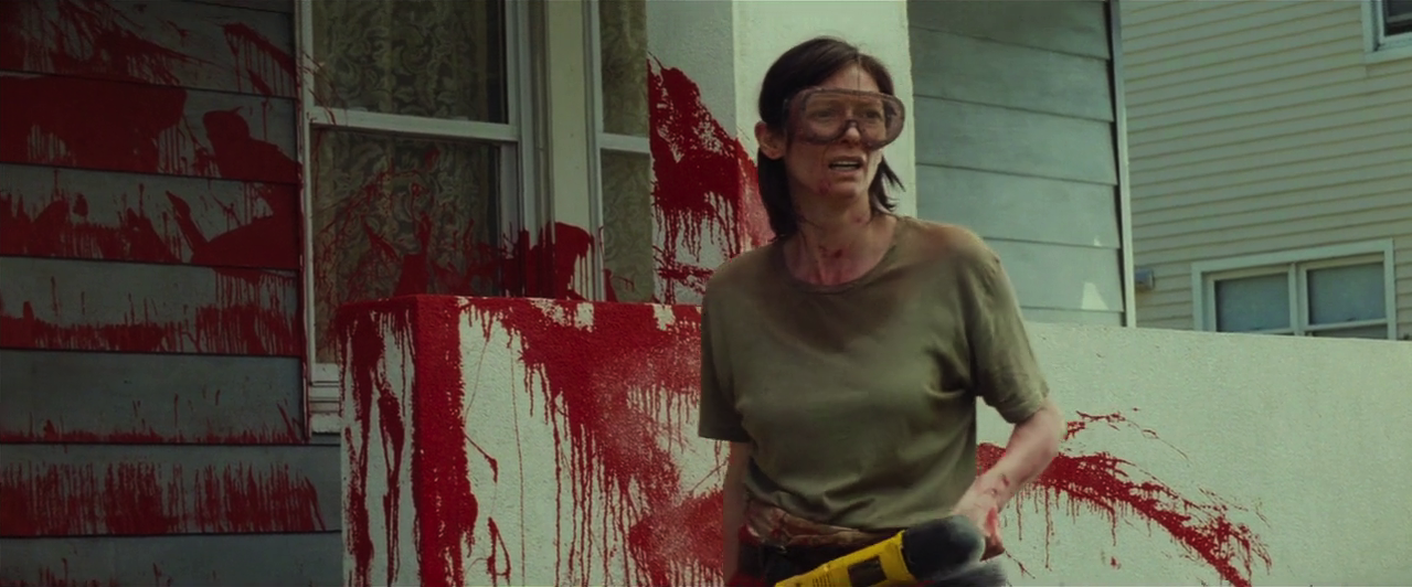 케빈이 모두를 죽이고 떠난 자리. 에바는 그 자리를 떠나지 않는다. 에바는 그 동네, 그 집에 그대로 산다. 옆집에 케빈이 죽인 친구의 부모가 사는 집. 케빈이 자신의 딸과 남편마저 죽인 집. 그 집에서 매일 동네 사람들의 비난과 테러를 받고, 매일 밤 케빈과 가족들이 나오는 악몽을 꾸며 자신의 삶을 살아낸다. 동네 사람들은 에바를 가만 두지 않는다. 악몽에 시달리고 일어나 집 밖에 나오면 집과 차는 온통 빨간 페인트로 테러가 되어 있는 게 에바의 일상이다. 에바는 그 빨간 페인트를 영화 내내 애를 쓰며 지운다. 무거운 그라인더를 들고 벽을 갈아내고, 거친 솔로 바닥을 박박 문대며 힘들게 지워낸다. 그때마다 에바의 손은 마치 피처럼 빨간색으로 물든다. 에바는 빨간 페인트가 묻은 그 손을 또다시 힘들게 비벼가며 지운다. 에바는 더 이상 자유를 갈망하지 않는다. 한때 잘나가던 여행작가였던 에바는 한 여행사 사무실에서 온갖 부당함을 당하며 허드렛일을 한다. 에바는 그 모든 삶을 감당한다. 그 팍팍한 삶을 살면서 매달 케빈에게 면회를 간다. 케빈은 여전히 에바에게 어깃장을 놓는다. “사람들은 TV에서 모범생을 보지 않아. 나 같은 사람을 보지.” 케빈의 중2병은 여전하다. 그렇게 2년의 시간이 흐른다.