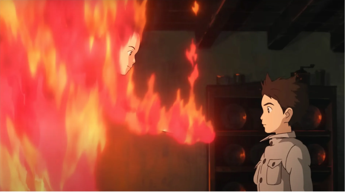 마히토는 이세계에서 불의 소녀 히미를 만난다. 히미는 마히토가 그토록 되찾고 싶어했던 마히토의 엄마다. 하지만 그녀는 마히토의 엄마이지만, 엄마의 모습을 하고 있지 않다. 친구의 모습을 하고 있다. 히미는 마히토가 자신의 미래의 아들이라는 것을 안다. 하지만 히미가 마히토를 끌어안는 장면은 엄마가 아들을 안는 느낌은 아니다. 오히려 한 소녀가 좋아하는 남자아이를 안는 느낌이다. 그녀는 마히토가 꿈에서 보던 죽은 엄마도 아니고, 왜가리가 물로 만든 가짜 엄마도 아니다. 마히토의 엄마는 불 속으로 사라졌지만, 히미는 불에서 나와 마히토에게 손을 내민다. 히미는 마히토의 엄마이지만 엄마가 아니고, 엄마가 아니지만 엄마인 존재다.