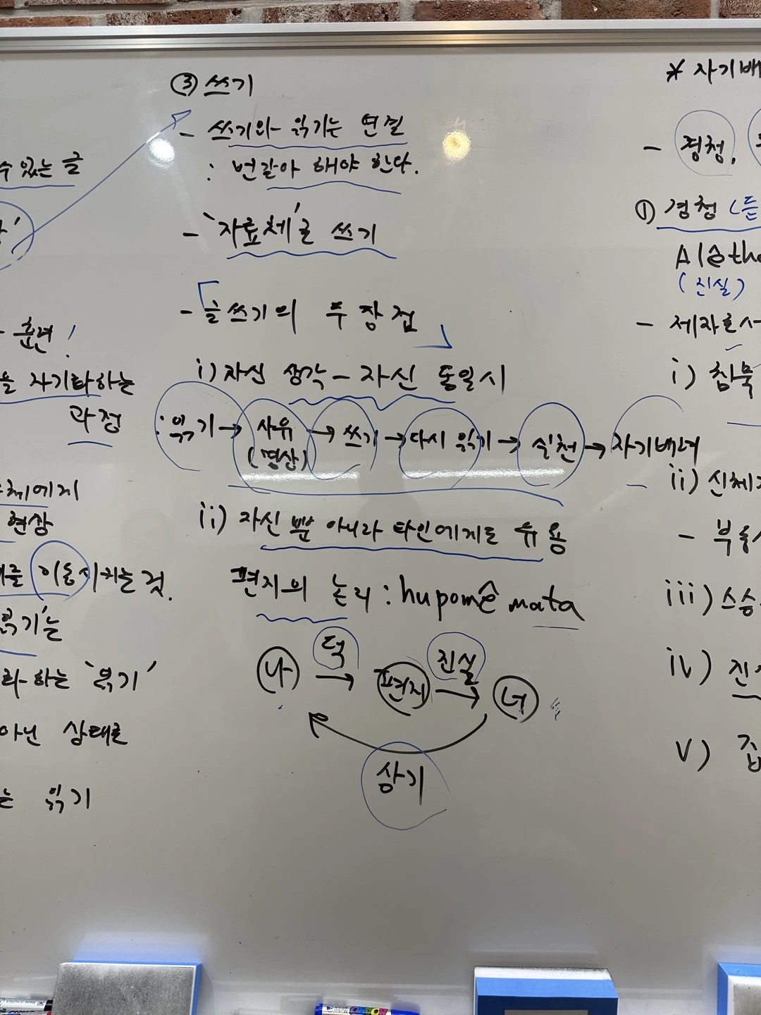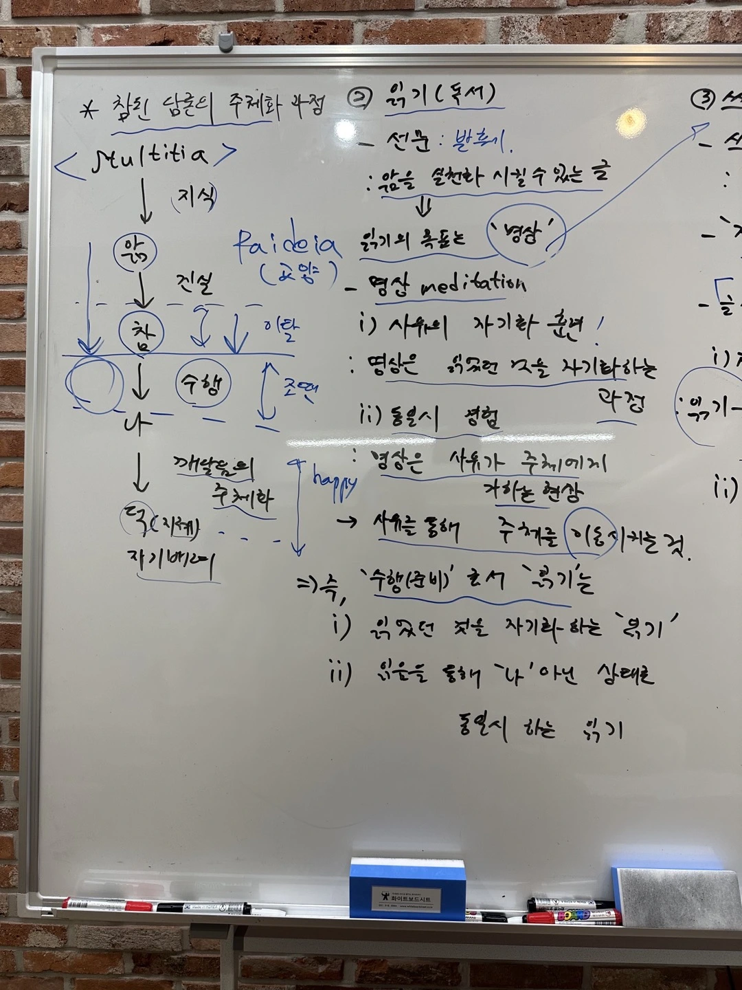 스승과의 파르헤시아(정직하게 말하기) 순간을 기억해본다. 아마도 내가 철학을 배우는 곳에서 내가 스승의 말을 듣고 질질 짜는 장면을 한 번도 못본 사람은 없을 것이다. 오늘 운동을 하면서 갑자기 떠오른 생각이다. 내가 눈물을 흘렸던 순간이 전부 다 스승의 파르헤시아의 순간이었구나. 그 눈물은 두 가지 의미가 있었던 것 같다. 스승의 파르헤시아는 두 가지 느낌으로 온다. 위로로 올 때도 있고, 반발심으로 올 때도 있다. 위로로 올 때는 이런 느낌이다. “맞아요. 저 사실 그때 아팠어요. 근데 제가 상처받았다는 사실을 아무도 몰랐고 저도 몰랐어요. 선생님이 처음 알아주는 거예요. 엉엉.” 그리고 반발심으로 올 때는 이런 느낌이다. “저도 알아요. 저도 이런 제가 싫다고요!!!” 뭐랄까. 나는 스승에게 개기질 못하니 저런 말을 입 밖으로 내뱉지는 못한다. 그래서 걍 질질 짜기만 하는 것이다. 내가 의식하지 못했지만 무의식중에 내가 가장 싫어하는 내 모습을 스승이 파르헤시아로 꺼냈을 때 보통 저런 반응이었다. 자기혐오가 찰랑찰랑 거리는 사람은 그걸 건드리면 반발심 혹은 외면으로 자기를 보호하는데(자기 자신을 싫어하고 싶은 사람은 없다), 나는 반발도 외면도 못하니까 그 공황이 눈물로 터져버리는 거다. 그런데 그 눈물에는 카타르시스의 효과가 있다. 그렇게 엉엉 울고 나면 자기혐오에서 감정이 좀 떨어져 나간다. 그러고 시간이 좀 흐르면 스승이 끄집어낸 파르헤시아에서 ‘수사’를 떼고 ‘진실’을 볼 수 있을 정도로 마음이 좀 가라앉는다. 그때 보통 나는 글을 쓴다. 사실 내 글은 스승이 나에게 말해준 파르헤시아를 나와 동일시 하는 과정에 지나지 않는다. 나는 내 사유가 없다. 스승이 사유(명상)를 촉발하는 ‘읽기’를 해주고, 거기서 눈물 한 바가지 쏟고 혼자 좀 있다가 “그래, 쌤 말이 맞다. 그 모습이 나 맞구나.”라고 파르헤시아의 내용을 나와 동일시하는 쓰기를 한다. 그리고나서 내 글을 거의 스무 번은 넘게 다시 읽는다. 그건 나르시시즘 때문이기도 한데 그보다는 그 글에서 드러난 내 모습을 스승의 눈으로 다시 읽어보는 것에 가깝다. 내 글을 스승의 눈으로 다시 읽어보며 그 글에서 드러난 내 부족한 지점(?)을 다시 스스로 파악해보는 것이다. 스무 번 넘게 읽으면 내가 쓴 글이라 할지라도 내가 논리로 비약하는 부분이 어딘지, 중언부언 핑계 대듯 부연설명이 많은 부분이 어딘지, 잘 몰라서 대충 퉁 친 부분이 어딘지, ‘고백’을 하다가 너무 쓰레기 같아서 도중에 끊은 지점이 어딘지 다 보인다. 스무 번 넘게 읽으면 그 글을 쓸 때의 정념은 어느 정도 떨어져 나가기 때문이다. 그렇게 ‘다시 읽기’를 하면 다시 ‘명상’의 지점이 보여서 또 ‘쓰기’를 할 수도 있고, 아니면 그냥 거기서 새로운 ‘자기 인식’이 생겨서 ‘자기 실천’으로 넘어가게 되기도 한다. ‘자기 실천’의 동력은 사실 부끄러움이다. 내 이미지는 이렇다. 위로의 파르헤시아와 죽비의 파르헤시아가 있는데, “너 이게 힘들었구나”라는 위로의 파르헤시아는 부정적인 감정의 응어리를 녹여서 자꾸만 늪에 빠지는 마음을 정화하고, “너 이런 사람이잖아!”라는 죽비의 파르헤시아는 나를 부끄럽게 만들어서 스스로 걸을 수밖에 없게 만드는 느낌이다. 그리고 스승이 파르헤시아를 할 때 카이로스(기술)는 제자가 지금 늪에 빠져 있는지, 아니면 늪에서는 나왔는데 걸을 힘이 없는 건지를 잘 파악하는 데에서 시작된다. 늪에 빠져 있는 애한테 걸으라고 하면 늪에 더 빠진다. 늪에서 나와 마른 땅에 서 있는데 걸을 마음이 없는 애를 위로하면 걔는 계속 땅바닥에 누워 있으려 한다. 스승은 정말 힘든 자리다.
