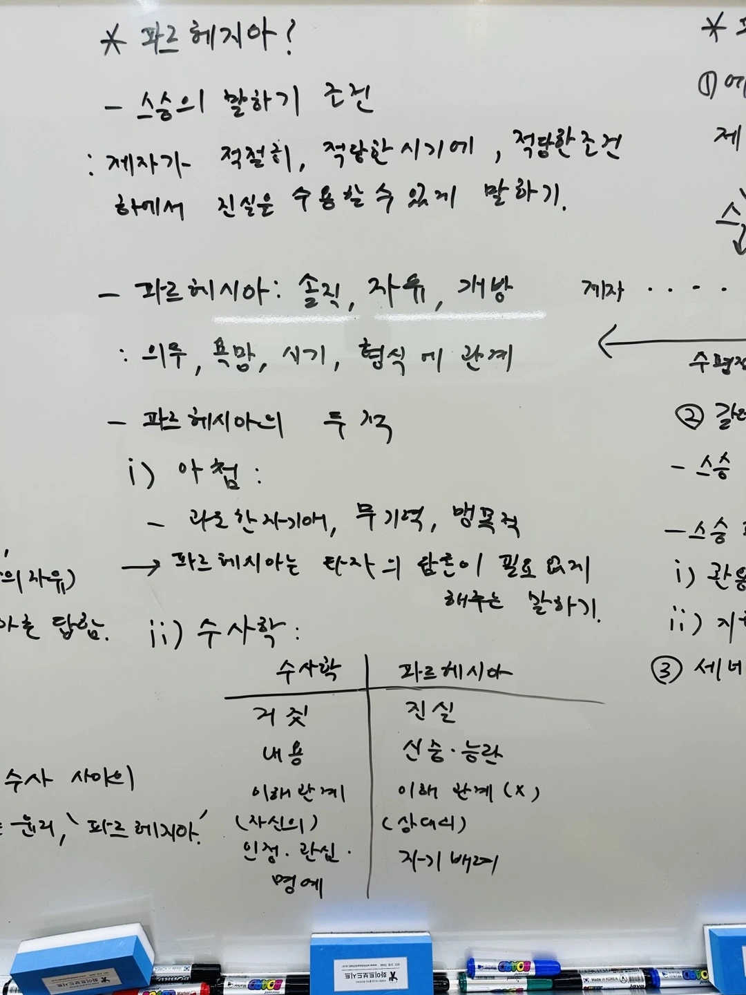 스승의 파르헤시아가 틀린 적은 없다. 스승이 파르헤시아를 했을 때 카이로스가 문제인 적이 있어도 그 파르헤시아의 내용 자체가 틀린 적은 없었다. 그게 전달이 되었든 안 되었든 돌이켜보면 스승의 말이 다 맞았다. 나에게 했던 파르헤시아도 그렇고, 다른 친구들에게 했던 파르헤시아도 그랬다. 그야말로 스승의 입장에서는 “I told you” 대잔치다. 다만 제자들이 그걸 다 기억하지 못할 뿐.
