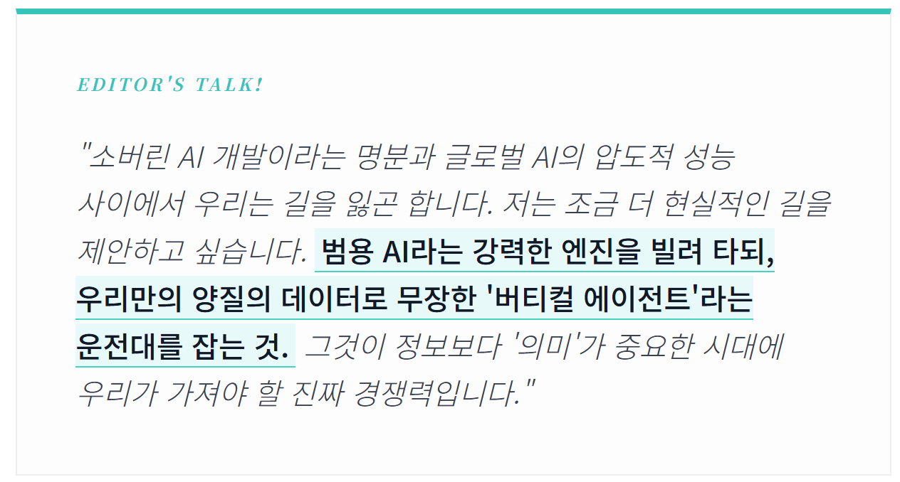 여기서 우리는 냉정한 현실을 직시해야 한다. 국가적 차원의 AI 개발은 중요하지만, 이미 압도적인 성능을 보여주는 글로벌 LLM(GPT, Gemini 등)과의 격차를 무시할 수는 없다.
