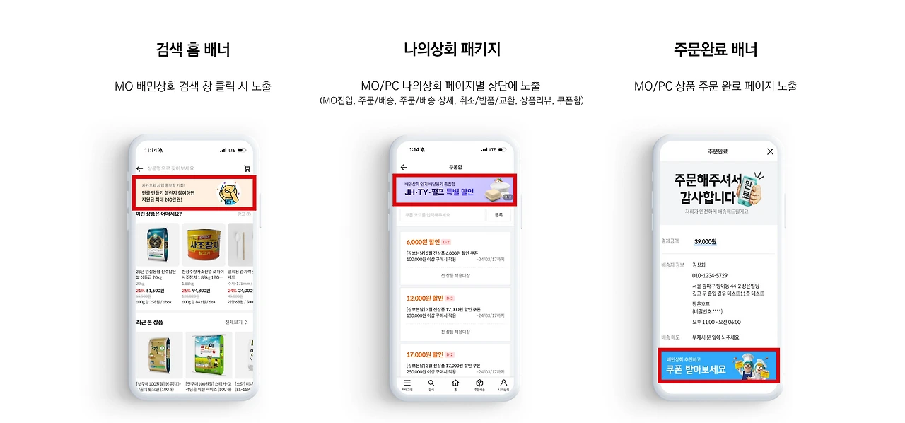 상품 구매 시 필수적으로 방문하는 검색 홈, 나의상회. 주문완료 페이지와 같은 관문 영역에 신규 광고 상품 출시