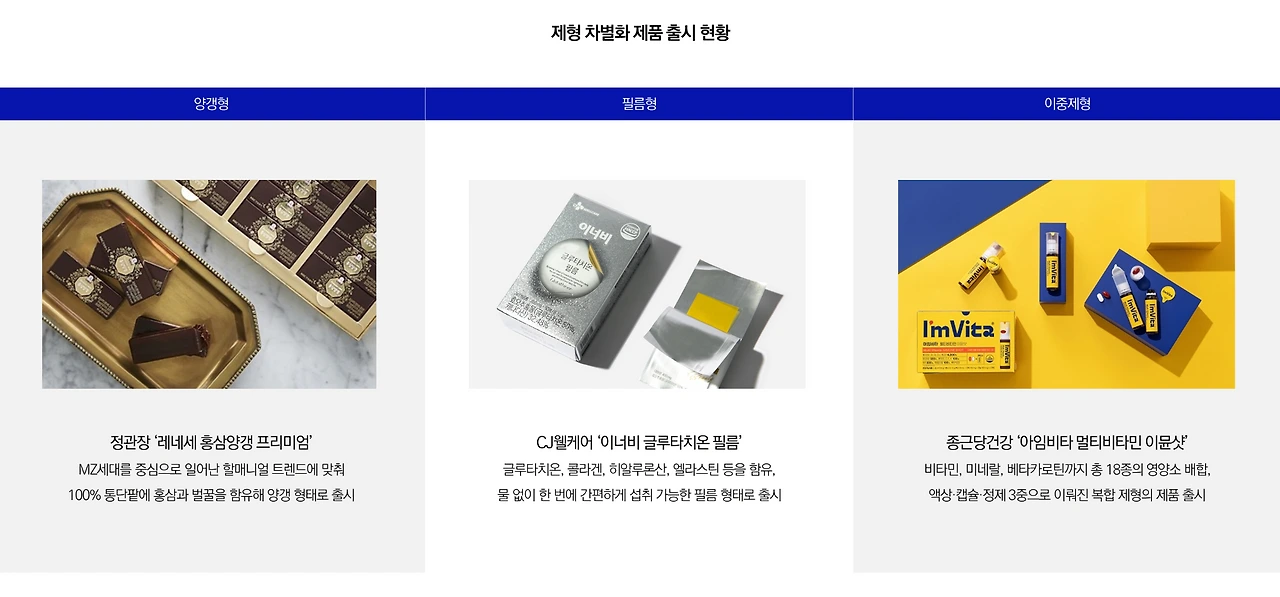 시장의 포화로 경쟁이 치열해지자 제형으로 차별화를 꾀하는 건기식 사업자들이 늘고 있습니다. 캡슐, 환 등 기존 형태에서 벗어나 휴대와 섭취 편의성에 초점을 맞춘 제형을 개발하여 소비자로부터 큰 호응을 얻고 있습니다.