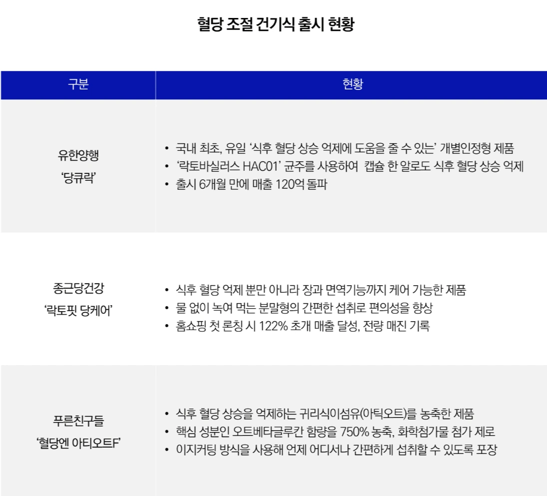 제로 슈거 열풍 속에서 당류에 대한 관심이 높아진 소비자들은 식습관의 변화와 더불어 혈당 관리 제품의 필요성을 인식하기 시작했습니다. 최근 2030세대 젊은 당뇨 환자의 급증으로 건기식 업계는 혈당 조절 건강기능식품에 더욱 공을 들이고 있습니다.