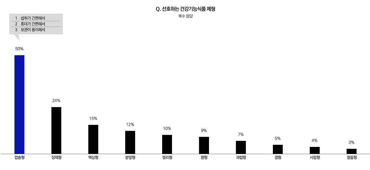 소비자들이 가장 선호하는 건강기능식품 제형은 섭취가 간편하고 휴대·보관이 용이한 캡슐형과 정제형입니다. 반면에 물 없이 언제 어디서든 섭취할 수 있는 액상형과 젤리형에 대한 선호도 높은 편입니다.