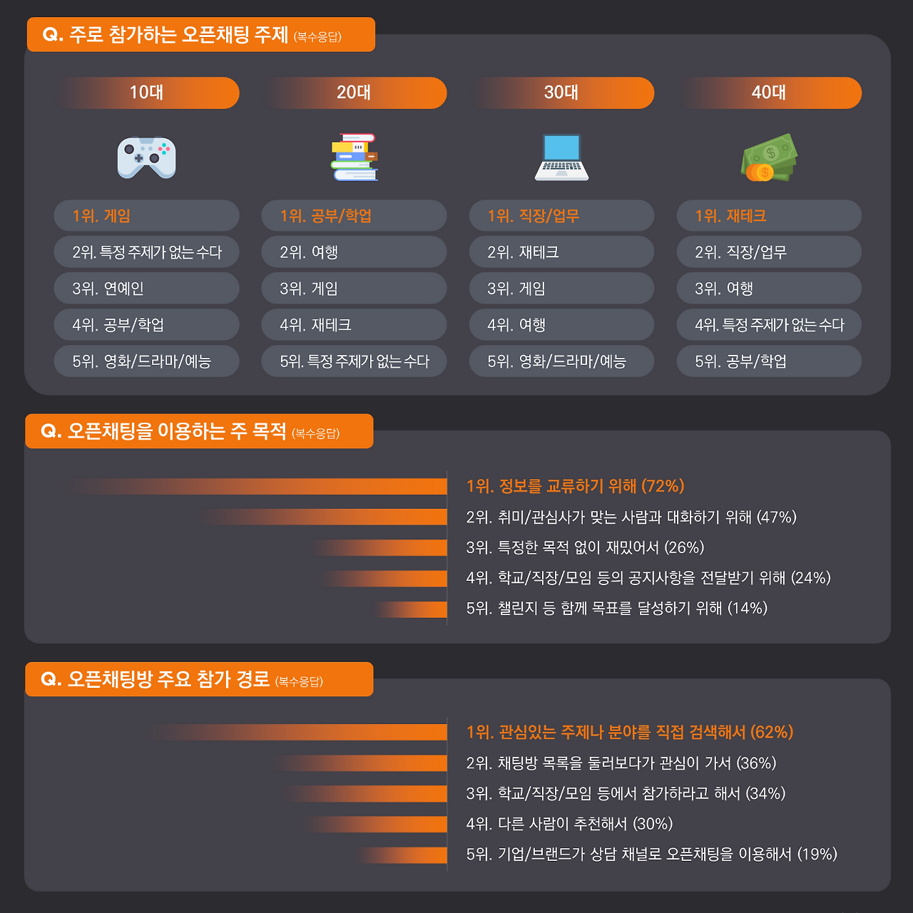 연령별로 관심사가 다른 만큼, 주로 참가하는 오픈채팅 주제 또한 연령별로 다르게 나타났습니다. 10대는 게임과 연예인에 대해, 대학생이 많은 20대는 공부/학업, 직장인이 많은 30대는 직장/업무, 40대는 재테크에 관해 주로 대화합니다.
