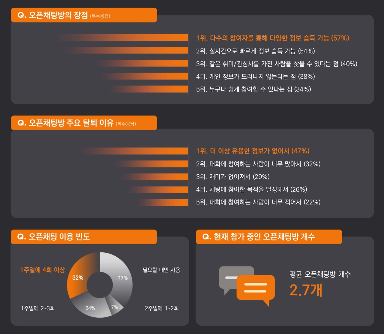 많은 사람들이 참여하는 만큼 다양한 정보를 습득할 수 있다는 점을 오픈채팅방의 가장 큰 장점으로 꼽았습니다. 또한 채팅 형식이기 때문에 실시간으로 빠르게 정보를 얻을 수 있다는 점도 중요하게 생각하는 모습입니다. 참여자의 다양성과 실시간성은 기존 커뮤니티와는 차별 되는 요소이기도 합니다. 또한 이용자들은 더 이상 유용한 정보가 없다고 생각될 때 오픈채팅방을 탈퇴한다고 응답했습니다. 이를 통해 오픈채팅 이용자들에게는 정보 습득이라는 실용적인 목적이 매우 중요함을 확인할 수 있습니다.