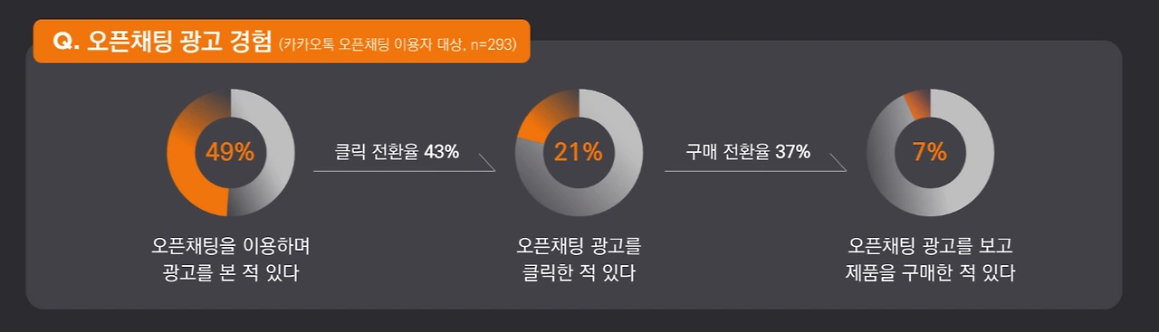 광고 지면이 있는 카카오톡 오픈채팅의 이용자를 대상으로 광고를 본 적이 있는지 질문했습니다. 그 결과, 이용자의 절반이 오픈채팅을 이용하며 광고를 본 적이 있다고 응답했습니다. 광고를 인지한 이용자 중 43%가 광고를 클릭한 적 있다고 응답했으며, 이 중 37%는 구매까지 경험한 것으로 나타났습니다.