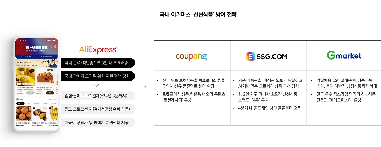 국내 콜드체인 물류망 부족으로 신선식품 배송 경쟁력이 부족한 알리에 맞서 국내 이커머스 업계는 배송 및 식품 카테고리 강화 등 방어에 총력