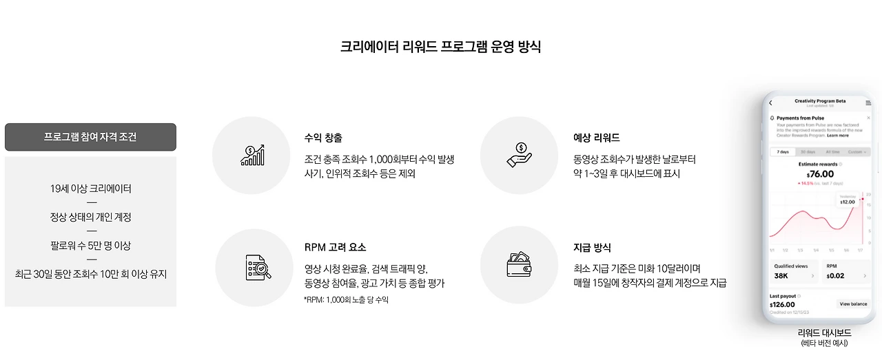 독창성, 재생시간, 검색 가치, 시청자 참여 등 4가지 핵심 지표를 기반으로 1분 이상의 고품질 오리지널 콘텐츠를 제작한 크리에이터에게 보상 제공