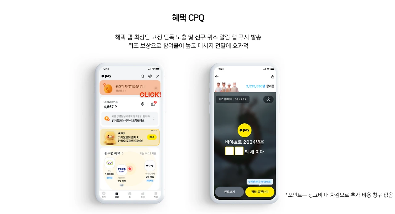 퀴즈 정답을 맞출 시, 카카오페이 포인트가 제공되어 유저의 참여도가 높은 광고 상품