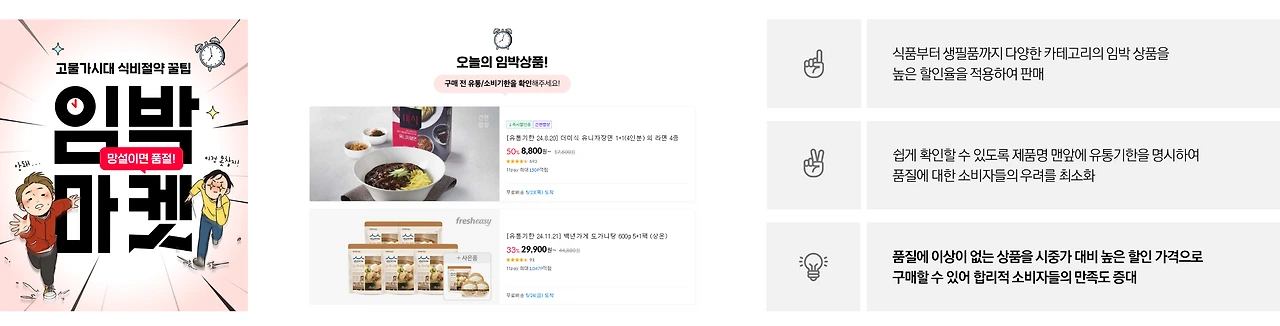 11번가는 소비기한이 임박했거나 재고가 과다하게 남은 제품을 저렴하게 판매하는 ‘임박마켓’ 서비스를 오픈하였습니다. ‘고물가시대 식비절약 꿀팁’이라는 슬로건처럼, 소비자들에게 식품부터 생필품까지 다양한 제품을 50%, 75% 등 높은 할인율로 제공하는 것입니다. 빠르게 재고를 소진해야 하는 판매자와 저렴한 제품을 구매하고자 하는 소비자 모두를 만족시킬 수 있는 전략입니다.