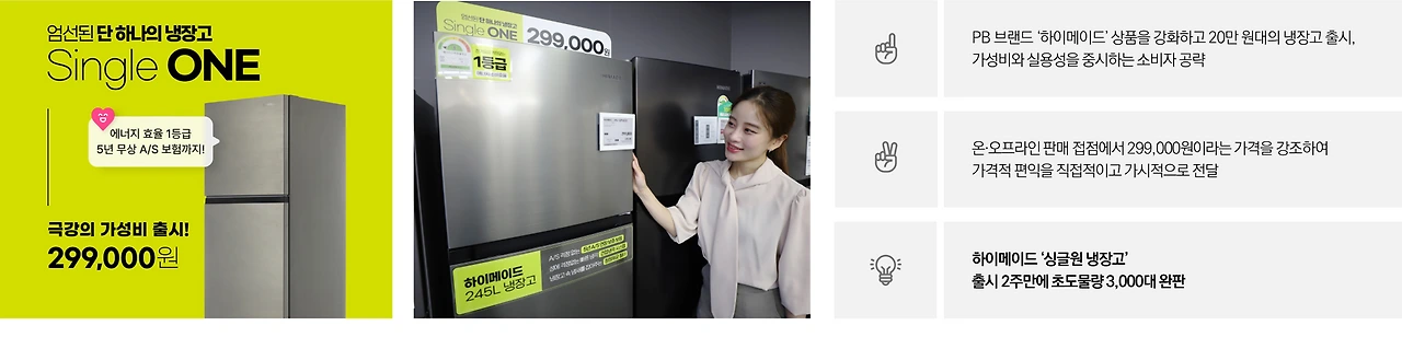 롯데하이마트는 PB 브랜드 ‘하이메이드’에서 20만 원 대의 가성비 냉장고를 출시하였습니다. 제조업체와 직접 계약을 맺어 가격은 낮추고, 품질은 유지하는 유통업계의 PB 브랜드는 고물가 시대에 합리적인 선택지가 될 수 있기 때문입니다. 비슷한 스펙의 타 브랜드 상품 출시가 대비 20% 정도 저렴한 가격이지만 필요한 기능은 모두 갖추어, 브랜드보다는 실용성을 중요시하는 소비자들을 효과적으로 사로잡을 수 있었습니다.