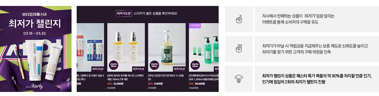 뷰티컬리는 ‘뷰티컬리페스타’ 기획전을 열면서 ‘최저가 챌린지’를 함께 진행했습니다. ‘최저가 도전’ 스티커가 부착된 상품의 구매 가격이 타 온라인몰보다 비쌀 경우 차액만큼 적립금을 지급해주는 것입니다. 최저가 보증 제도는 여러 플랫폼을 돌아다니며 가격을 비교하는 합리적 소비자들을 붙잡고 자사의 플랫폼에서 제품을 구매하도록 유도할 수 있었습니다.