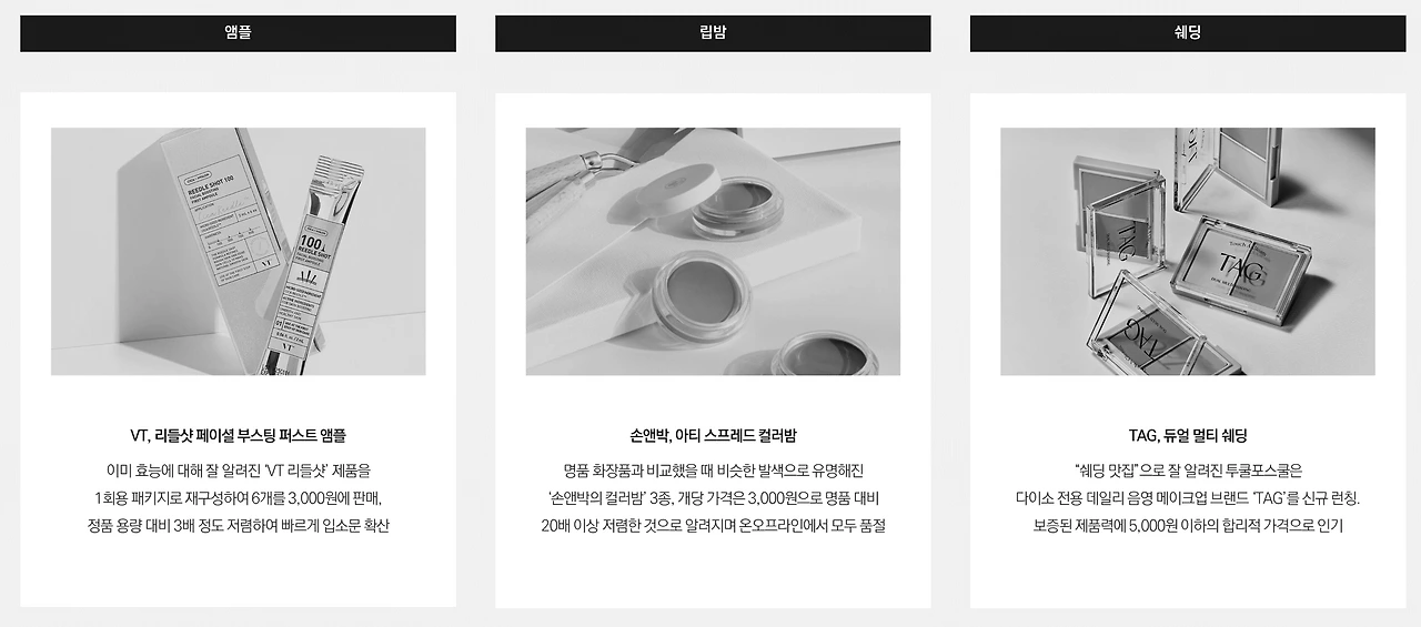 브랜드 상품과 비슷한 품질의 화장품을 500~5,000원 사이의 균일가에 판매하는 다이소가 각광받기 시작했습니다. 물가 부담이 커지고 가격의 중요성이 증가하자, 가성비 높은 제품이라면 브랜드를 과감하게 포기하는 소비 행태가 나타나고 있는 것입니다. 소비자들은 고가 제품과 가성비 제품의 성능을 비교하는 콘텐츠를 자발적으로 공유하며, 성능이 우수한 제품을 저렴하게 산 것에 큰 만족감을 느끼고 있습니다.
