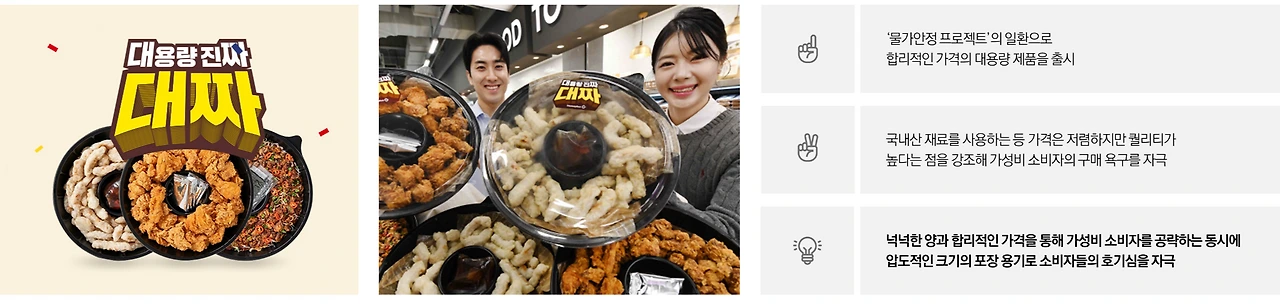 홈플러스는 1만 원 초반대의 가격에 3~4인 가족이 먹을 수 있는 대용량 즉석조리제품 ‘대짜’ 3종을 출시했습니다. 단순히 양만 늘린 것이 아니라 국내산 재료를 사용하고, 실제 전문점 수준의 맛을 구현하기 위해 여러 번의 테스트를 거치는 등 품질에도 신경을 썼습니다. 이러한 대용량 제품은 저렴하면서도 든든하게 한 끼를 해결하고 싶은 가족 단위 고객, 주부 고객의 니즈를 충족시켰습니다.