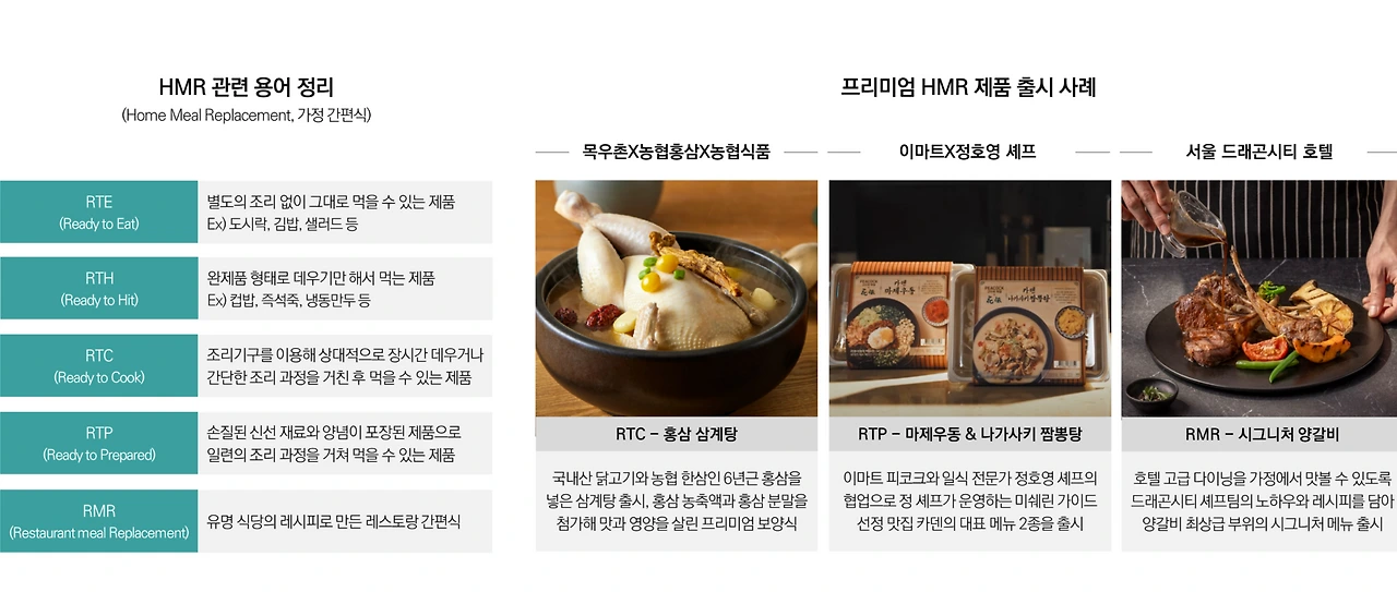과거 인스턴트식품이라는 부정적인 이미지에서 맛과 건강을 고려한 시성비 좋은 제품으로 소비자 인식이 바뀌어 HMR 시장이 더욱 커질 것으로 기대